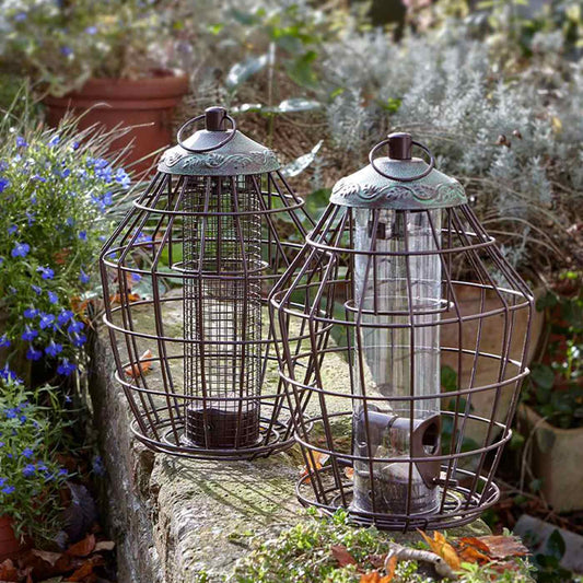We also offer feeding dishes, in addition to wall hanging bird feeders. Why not opt for a dual feeder? This design allows you to offer two types of seed at once. If you’re keen to keep other garden visitors at bay, we also stock squirrel proof bird feeders.
