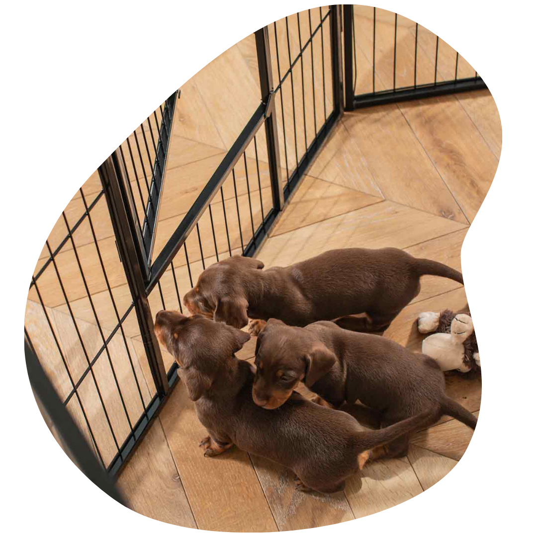 Crates are essential when it comes to house training your new puppy. We always suggest buying a larger size dog crate and bed for your puppy so they can grow into it, saving you from having to purchase a new crate when they’re older.