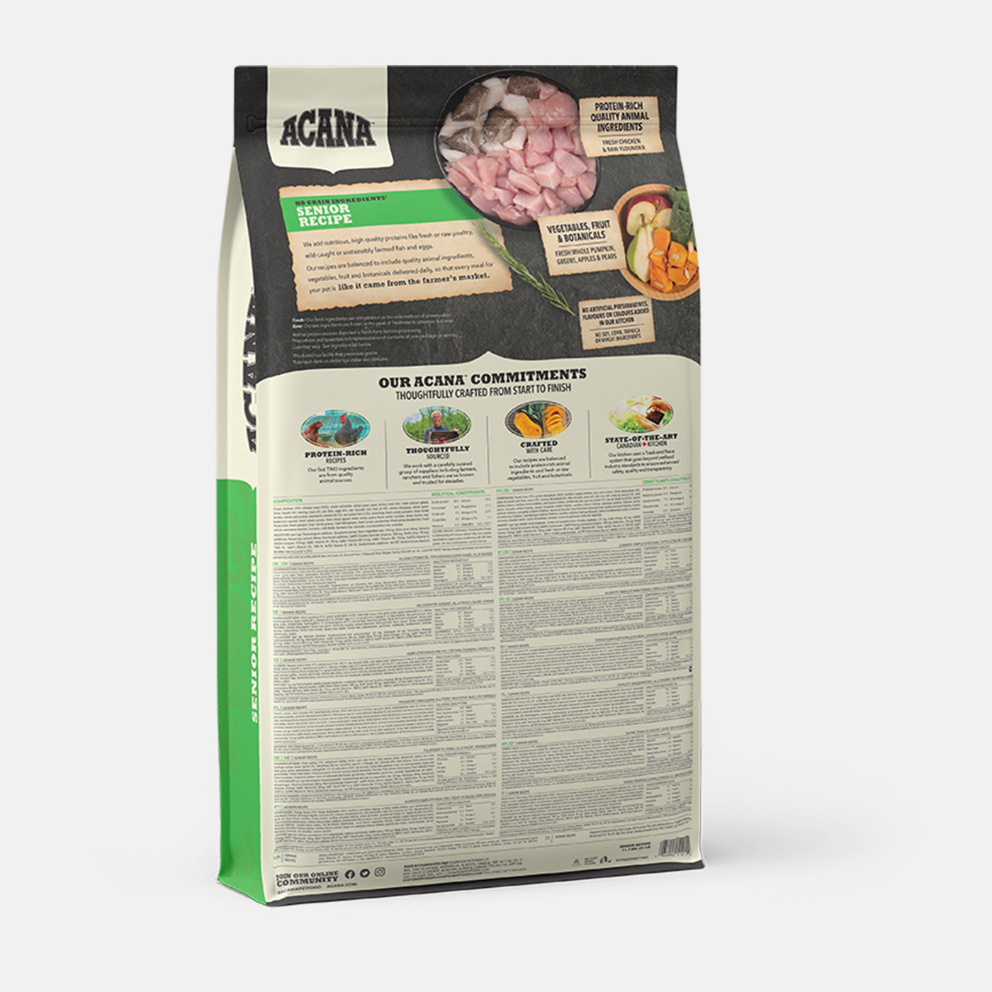 Your senior dog needs a diet rich in animal protein to support lean muscle and to promote a healthy body weight. ACANA Senior features higher protein levels from chicken, raw flounder, and eggs, helping your dog maintain peak health. ACANA nourishes dogs naturally, keeping them healthy, happy, and strong.