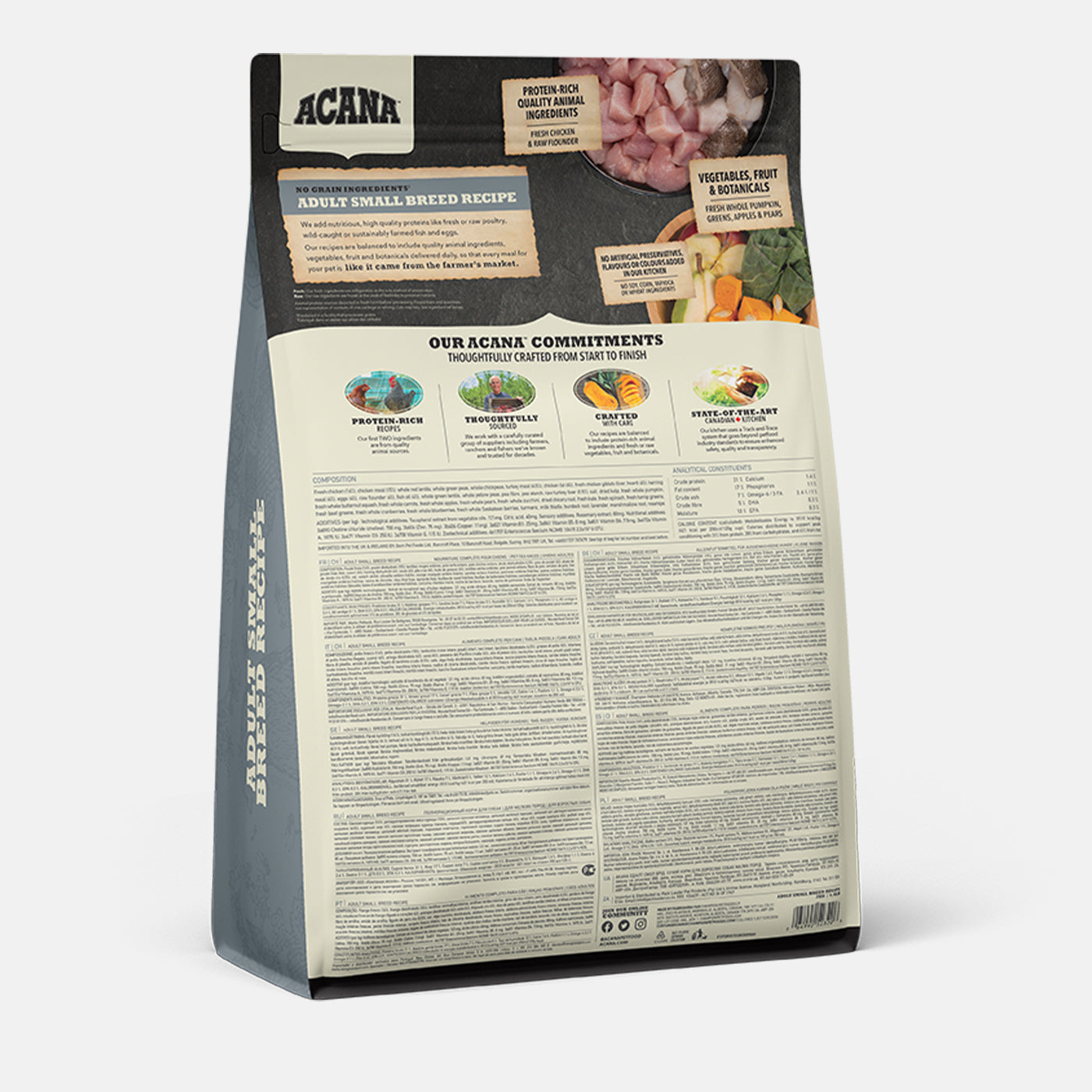 Small-breed dogs have the same nutritional requirements as larger dogs. This means they need a diet that is rich and varied in whole animal ingredients in order to get the protein and nutrients they require for peak health. ACANA Small Breed is loaded with chicken and raw flounder, with the added nutrition of eggs, delivering everything your small-breed dog needs in order to stay happy, healthy, and strong.