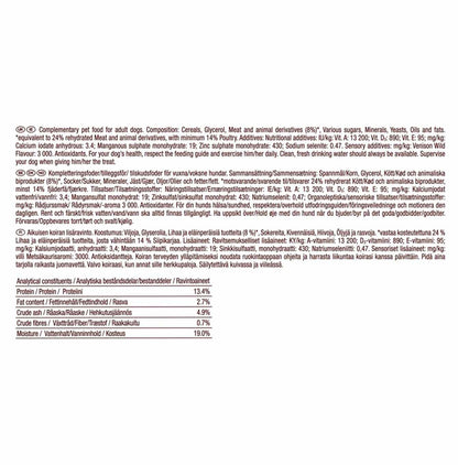 Strips packed with delicious venison flavour. Yummy strips that can be torn into smaller pieces that are low in fat and no added colours.