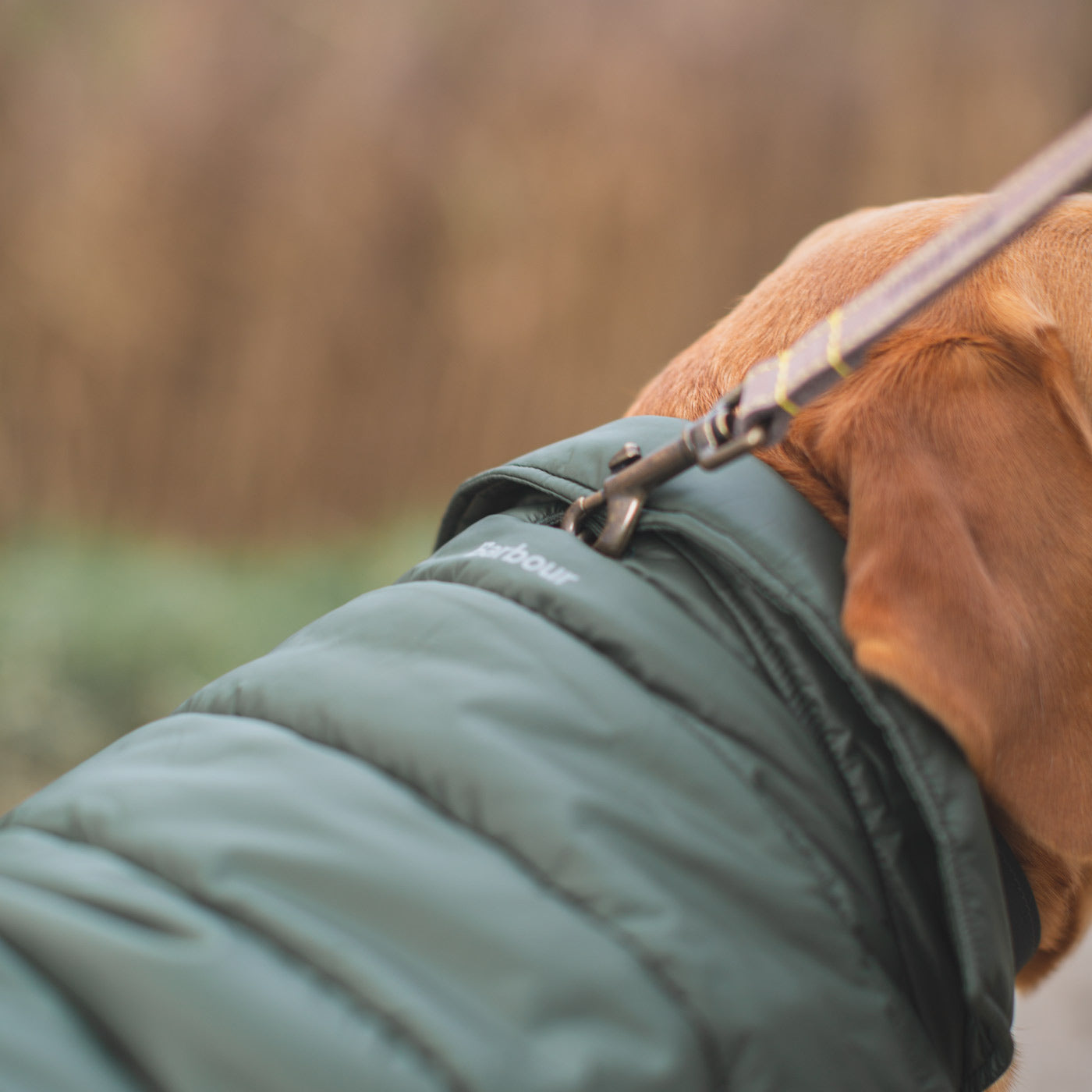 Stylish all over quilted Barbour dog coat, padded for extra warmth. With an opening for attaching a lead. Machine washable and available in four sizes and two colours.