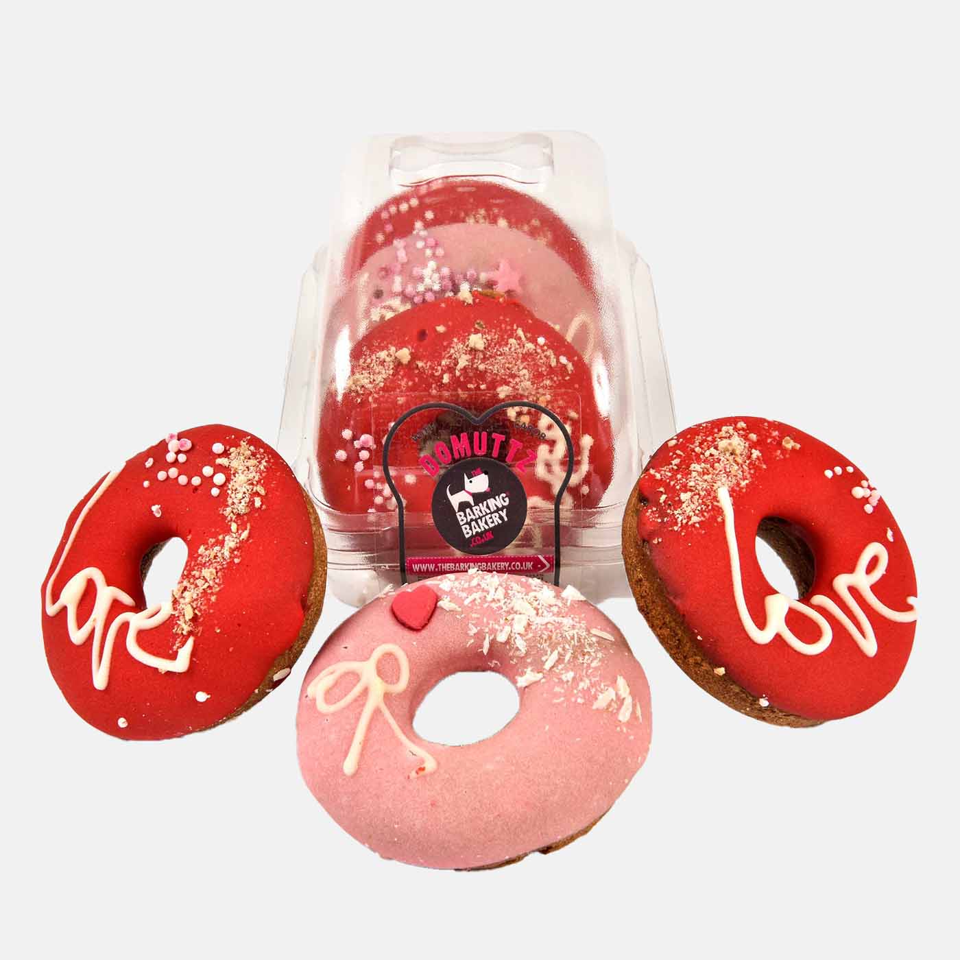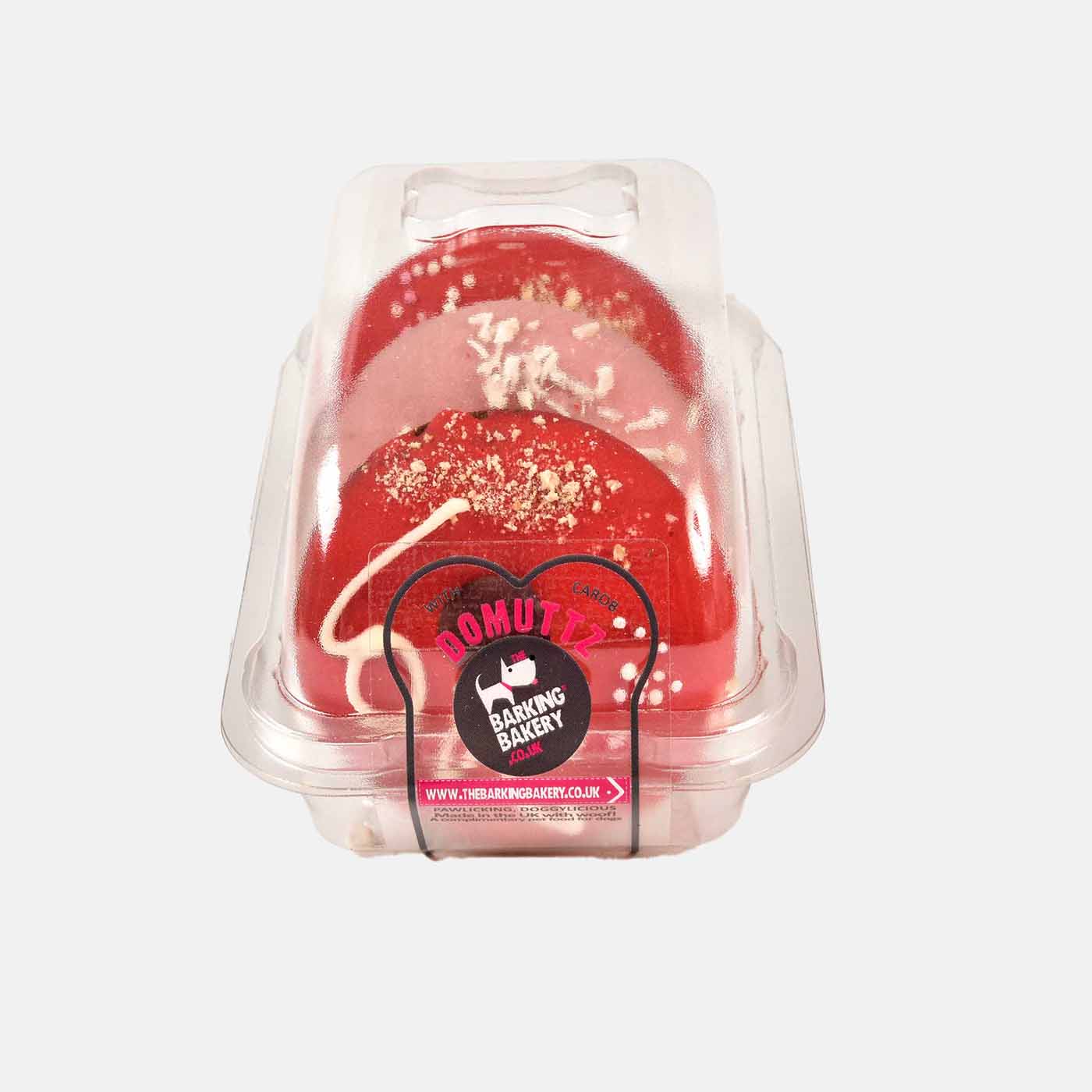 Treat your pup to a special Valentine's Day surprise with Barking Bakery's 'I Woof You' Domuttz! Hand-decorated in pink and red yogurt, these light and fluffy vanilla sponge donuts are the perfect way to show your furry friend just how much they mean to you. Pack of three donuts.