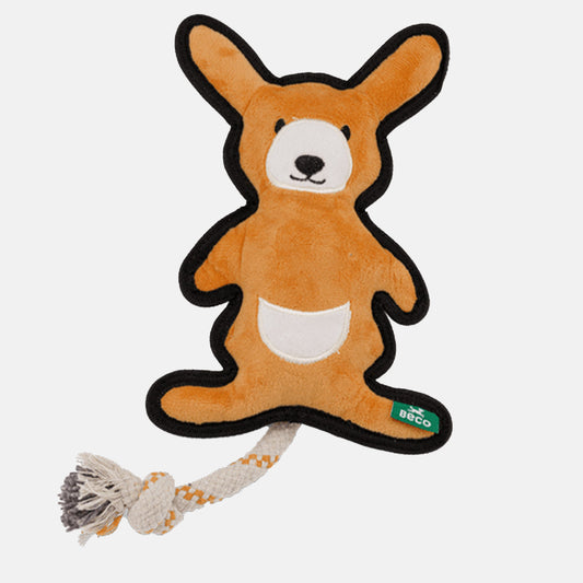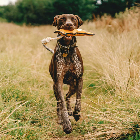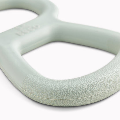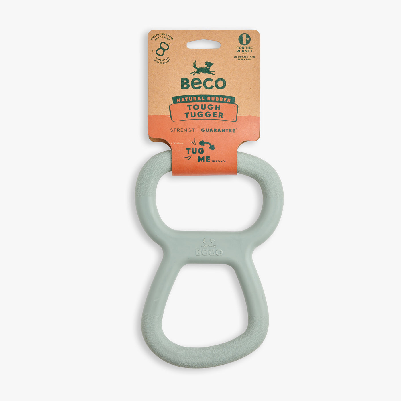 A natural rubber toy specifically designed for tug-o-war. The textured handles at each end give you both a strong grip. The springy rubber fl exes as needed to help reduce the jars and jolts of your dog’s pulling power - let the games begin.