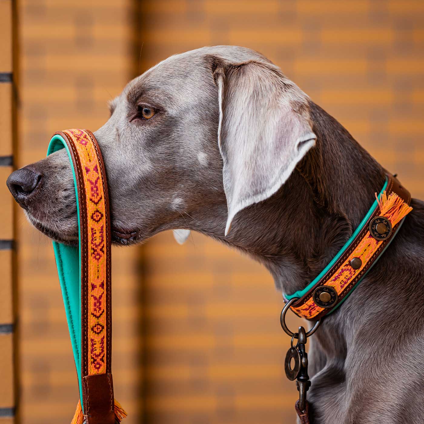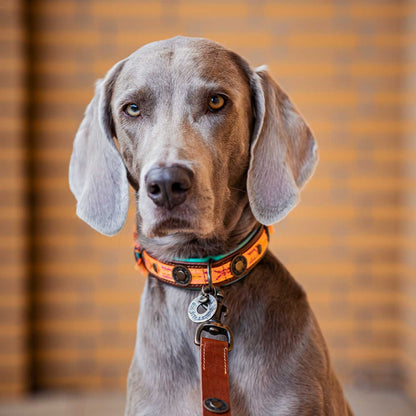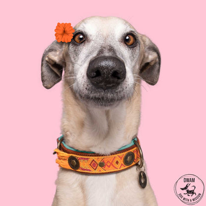 Elevate your furry friend's style with Boho Chica Dog Collar by DWAM. This beautifully homemade design provides a fresh Bohemian look, while the eye-catching pattern ensures that your pet stands out. Crafted with tough leather and soft padding for comfort, it is detailed with copper buttons for a stylish finishing touch. Available in 7 sizes for a perfect fit. Complete the set with a matching lead. Definitely a must-have for every stylish pup!