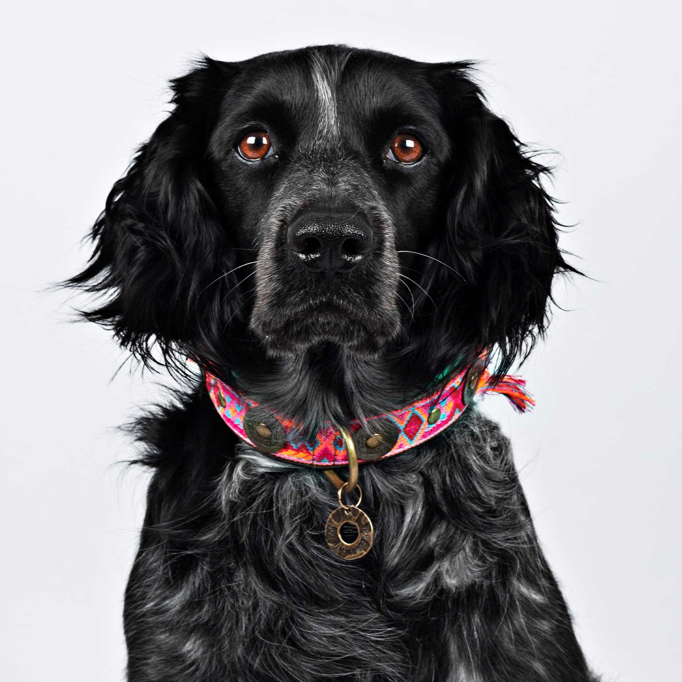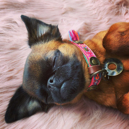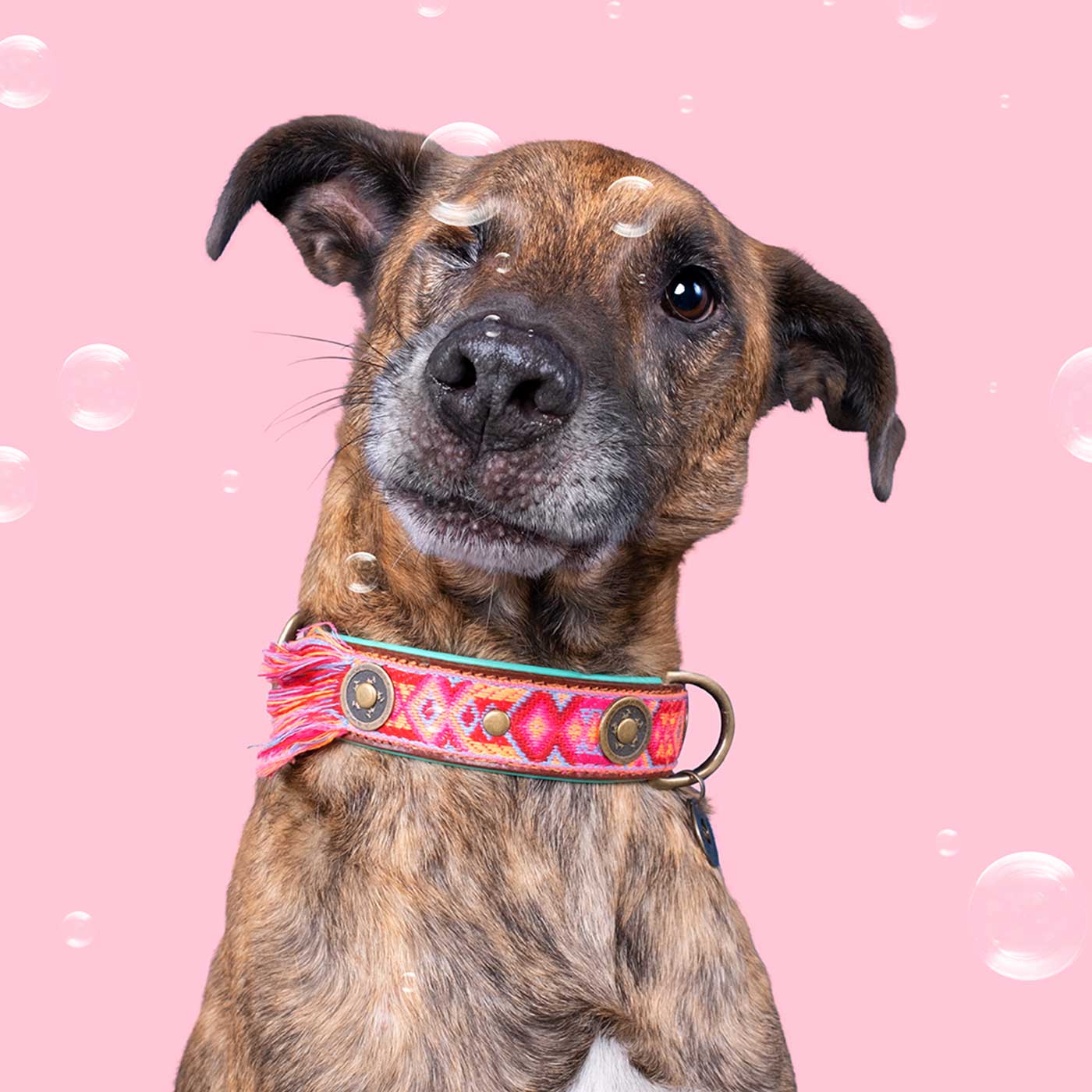 The Boho Rosa Dog Collar by DWAM offers a beautifully handcrafted design for a fresh, Bohemian-inspired look. With an eye-catching pattern and vibrant pink colour, your pooch is sure to stand out. Made with tough leather and soft padding for comfort, detailed with unique copper buttons. Available in 7 sizes. Complete the style with the matching lead.