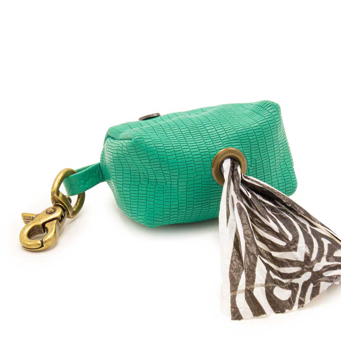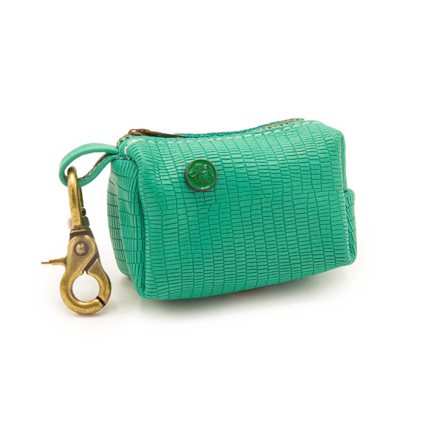 The Boomer Poop Bag Holder by DWAM features beautiful green leather with a lizard-embossed finish for style and durability. Its strong clip and zip fastening will keep your poop bags secure and safely in place, while the brass-effect hardware adds a touch of sophistication. Enjoy a classy and practical way to store your bags.
