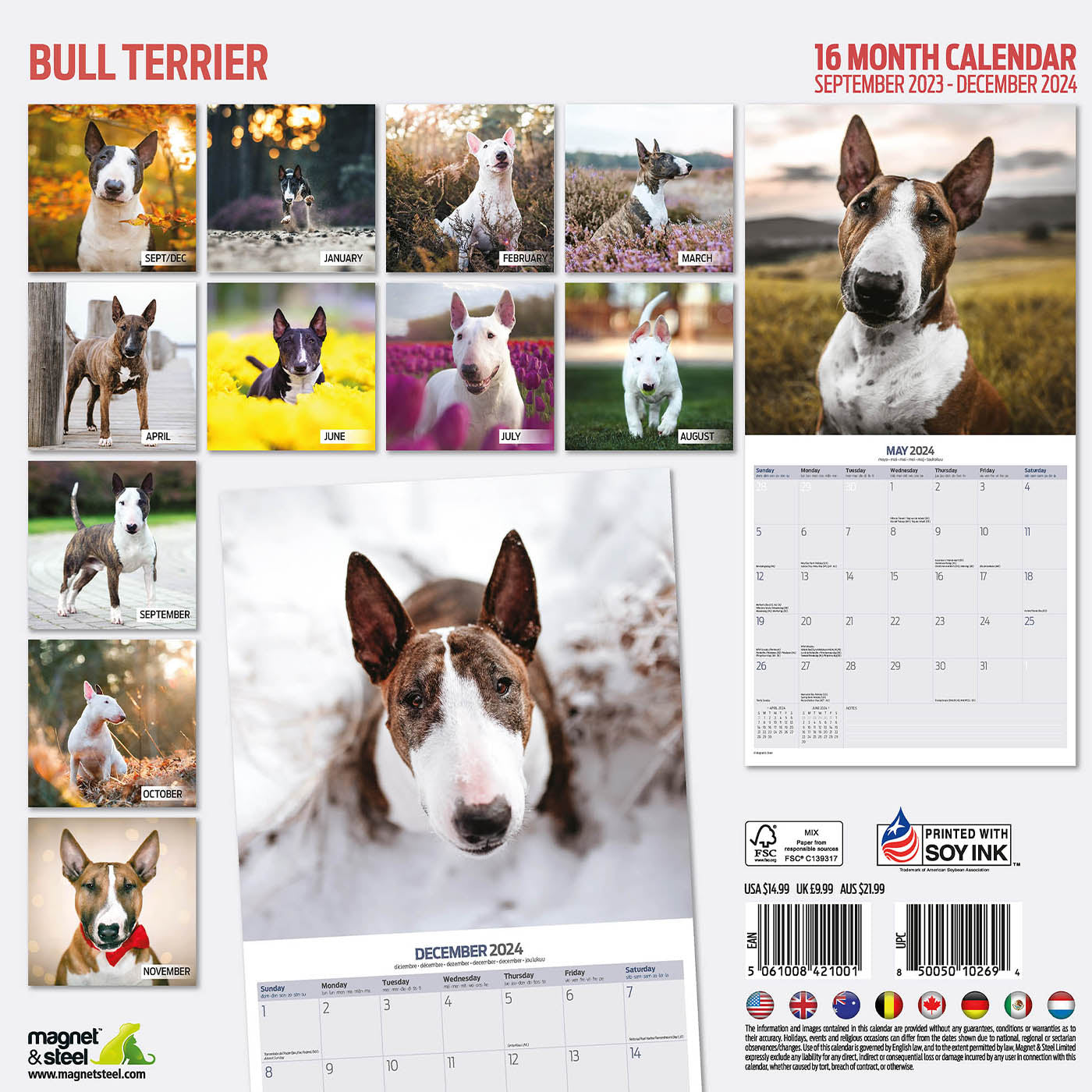 Discover the Bull Terrier Traditional Calendar 2025, the perfect gift for Terrier lovers. Featuring a cute photo for every month, along with a clear grid and space for notes, this 16 month calendar will keep you organised from September 2024 to December 2025. Order now and enjoy the upcoming year with your furry friend.