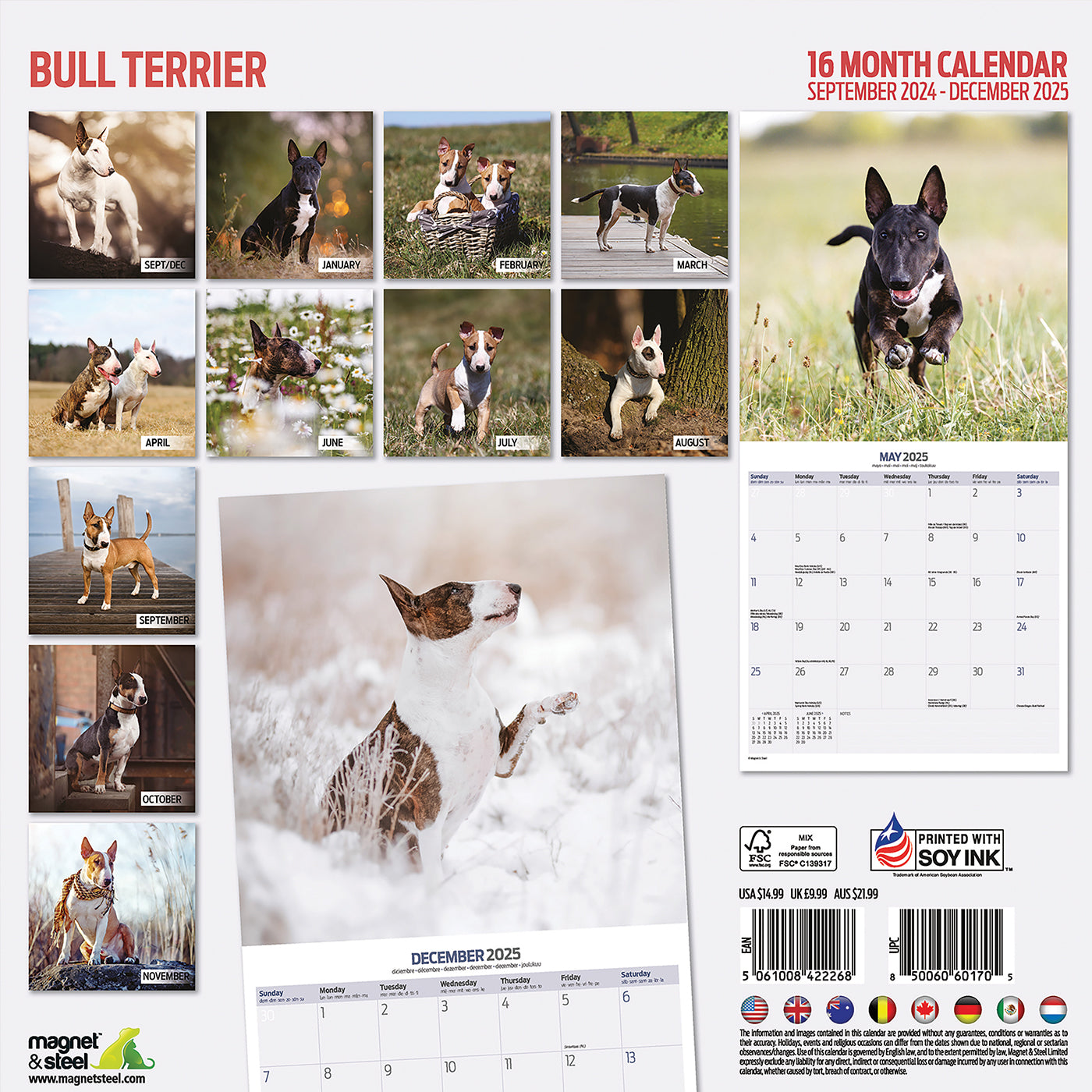 Discover the Bull Terrier Traditional Calendar 2025, the perfect gift for Terrier lovers. Featuring a cute photo for every month, along with a clear grid and space for notes, this 16 month calendar will keep you organised from September 2024 to December 2025. Order now and enjoy the upcoming year with your furry friend.