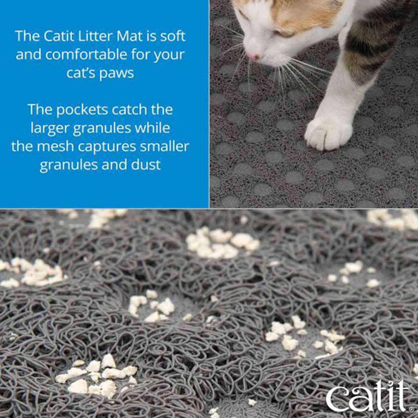 The surface is made up of large and small pockets which collect granules of all sizes. The mat is soft to the touch and extremely comfortable for your cat, easy to vacuum and rinse down.