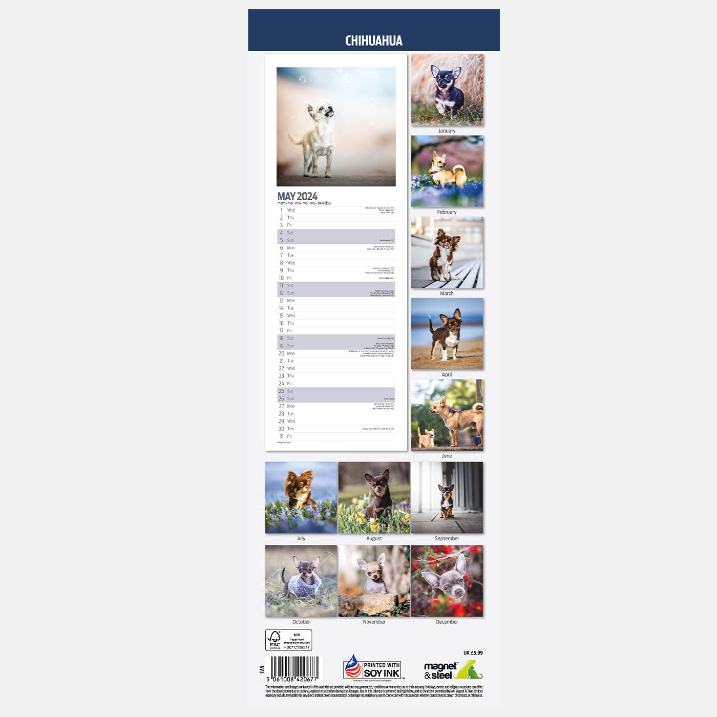 Stay organised and show your love for Chihuahuas with the Chihuahua Slim Calendar 2025. This perfect gift features an adorable photo for every month and a clear grid with space for notes. With its slim design, it takes up minimal room while keeping you on track. Don't miss out on this must-have calendar for every Chihuahua lover.
