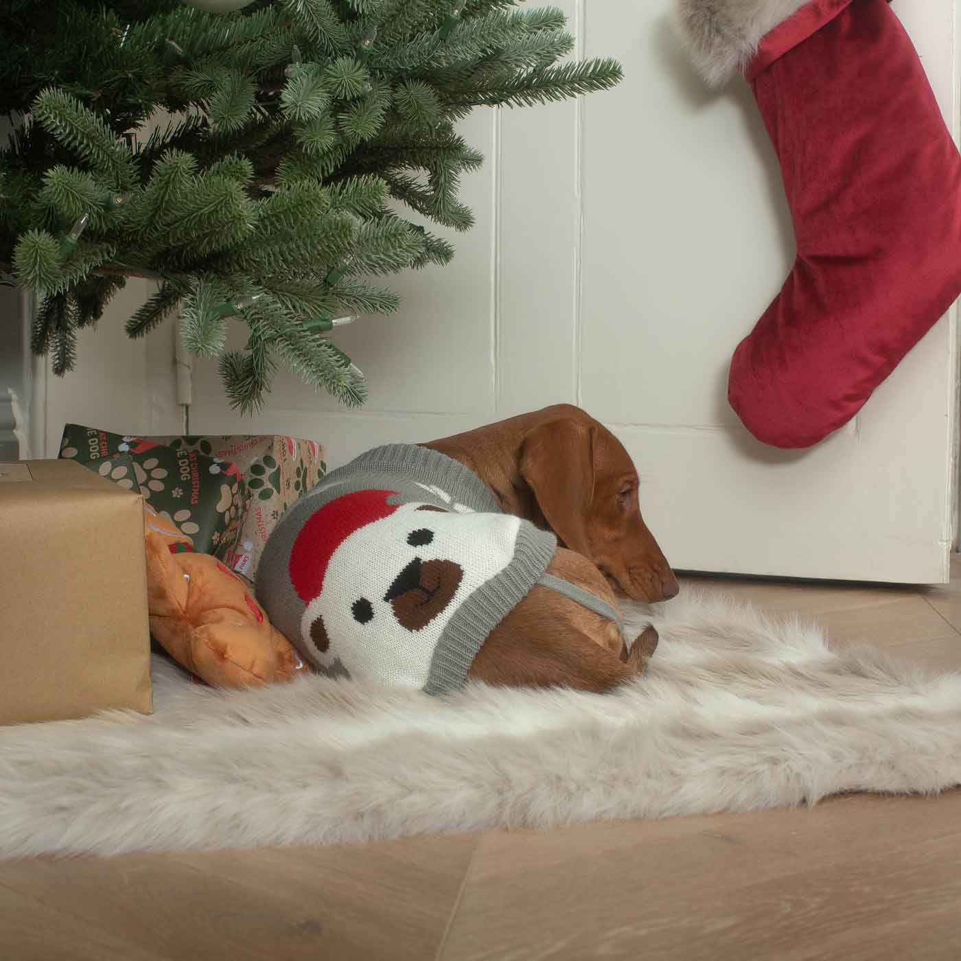 Included in this Christmas eve gift pack is a festive knit novelty dog jumper, a plush gingerbread squeaky dog toy and a 40g pack of real meat chicken (gingerbread shape) dog treats.
