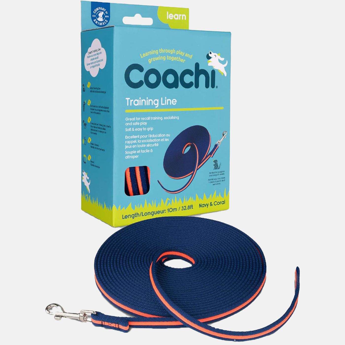 Enhance your pup's training experience with the Coachi Waterproof Training Line Navy & Blue 10m. It's long 10m line allows your four-legged friend more freedom to explore the outdoors, and enjoy it safely. This strong and durable line features a waterproof outer that keeps the line dry and easier to grip. And it's a breeze to clean up after use. More fun, more freedom, and less hassle—you and your pup will love it!