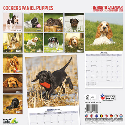 Stay organised with the Cocker Spaniel Puppies Traditional Calendar 2025. This 16-month calendar features a cute puppy photo for every month, along with a clear grid and space for notes. The perfect gift for Spaniel lovers, it covers September 2024 to December 2025. Get yours now and plan ahead with style!