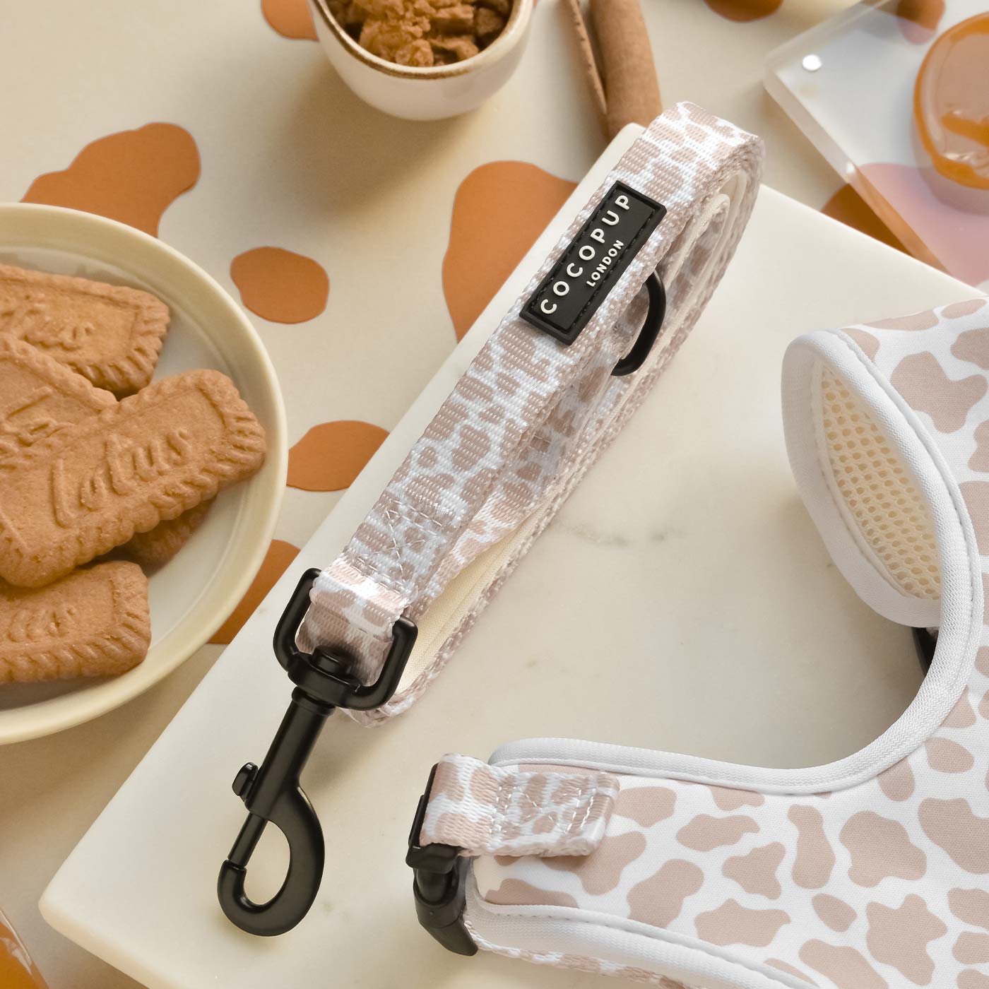 The Cocopup London Nude Cow Lead is the perfect accessory for pampered pooches. Crafted with a printed design and a soft neoprene handle, it offers your pup added comfort and a stylish look. The lead also features a swivel clip for easy attachment, plus an additional D-ring for carrying poop bags.