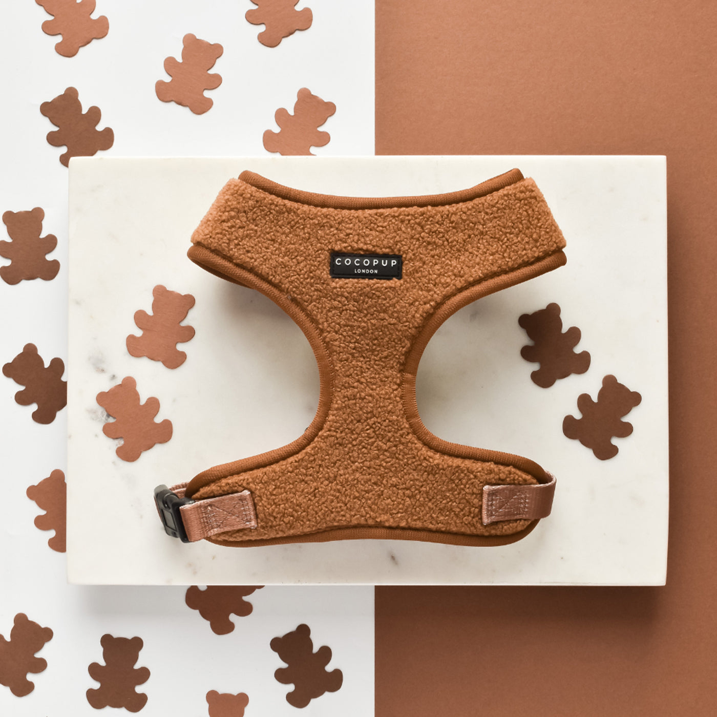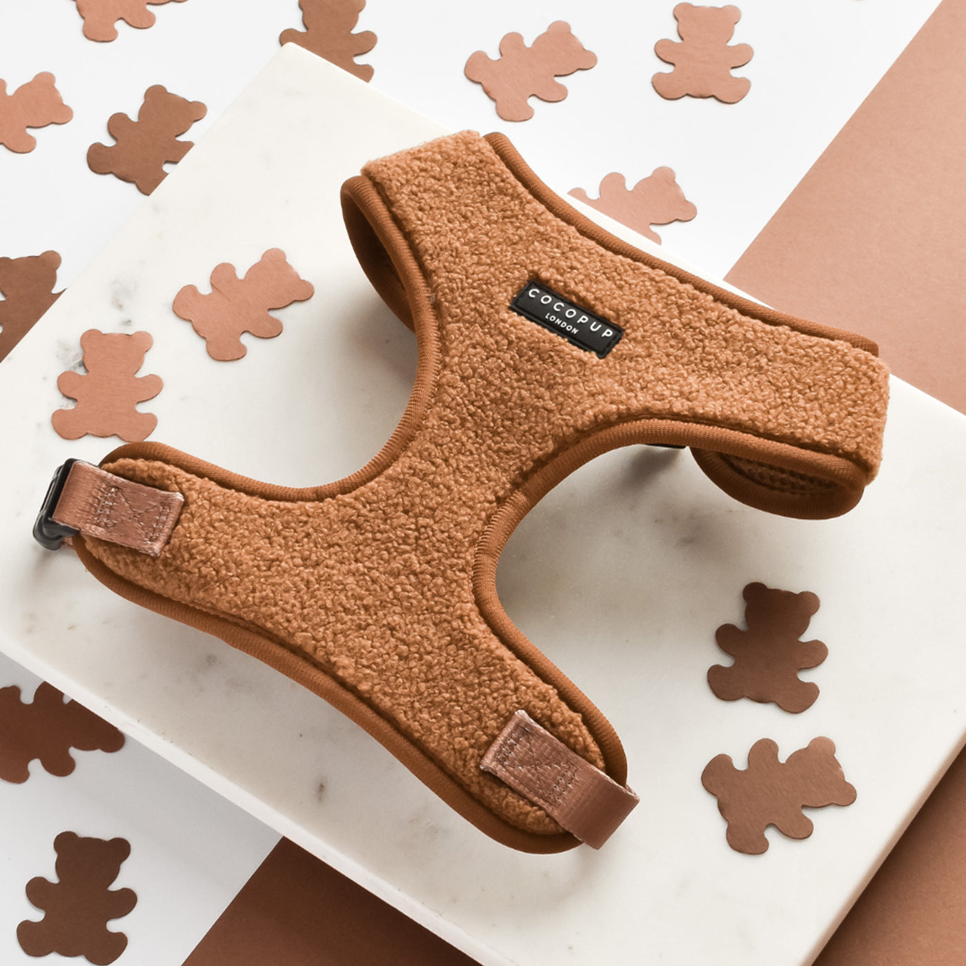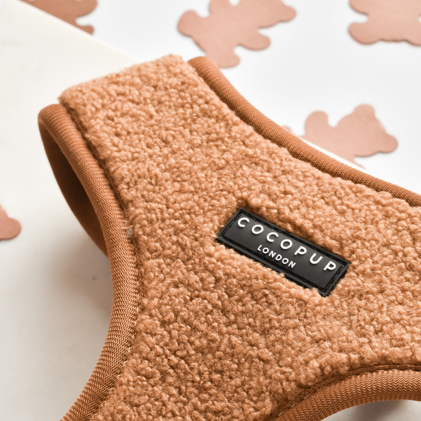 Cocopup London Paddington Teddy Adjustable Neck Harness is designed to be lightweight and comfortable for your pup. The super soft teddy material is neutral and warm brown and features a creamy neutral colour palette. This adjustable chest and neck harness has a black D ring for lead attachment and comes in four sizes to ensure the perfect fit.