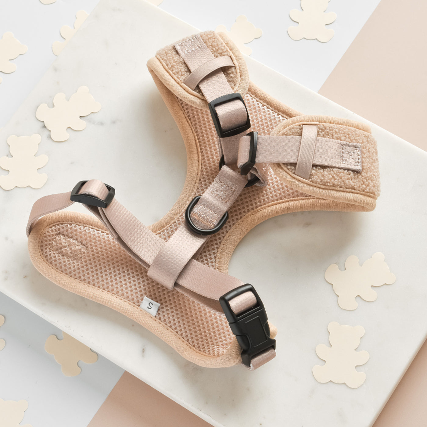 Cocopup London's Rupert Teddy Adjustable Neck Harness is perfect for any pup. Crafted from super soft teddy material, this neutral brown harness is lightweight and comfortable, with adjustable straps for a customized fit. The black D-ring provides secure lead attachment, and four sizes make it easy to find the perfect fit for your pup.