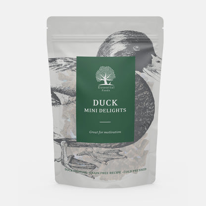 Give your pup the delicious delights they deserve with Essential Foods' Duck Mini Delights Dog Treats, packed with all that scrumptious duck. Perfect for spoiling your pup in training or taking on walks, these grain-free snacks will make your pup feel like a real showstopper! Get your 100g treat bag today and see your pup's tail wag!