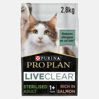 Treat your furry friend to the PRO PLAN Live Clear Sterilised Adult Cat Dry Food with Salmon - 2.8kg. Made with high quality salmon, it helps to maintain an ideal body weight while providing a delicious and healthy meal for your furball! The added fibre and low carb level means it's as good for cats as it is yummy. Get paw-sitive results with this purr-fect food choice!
