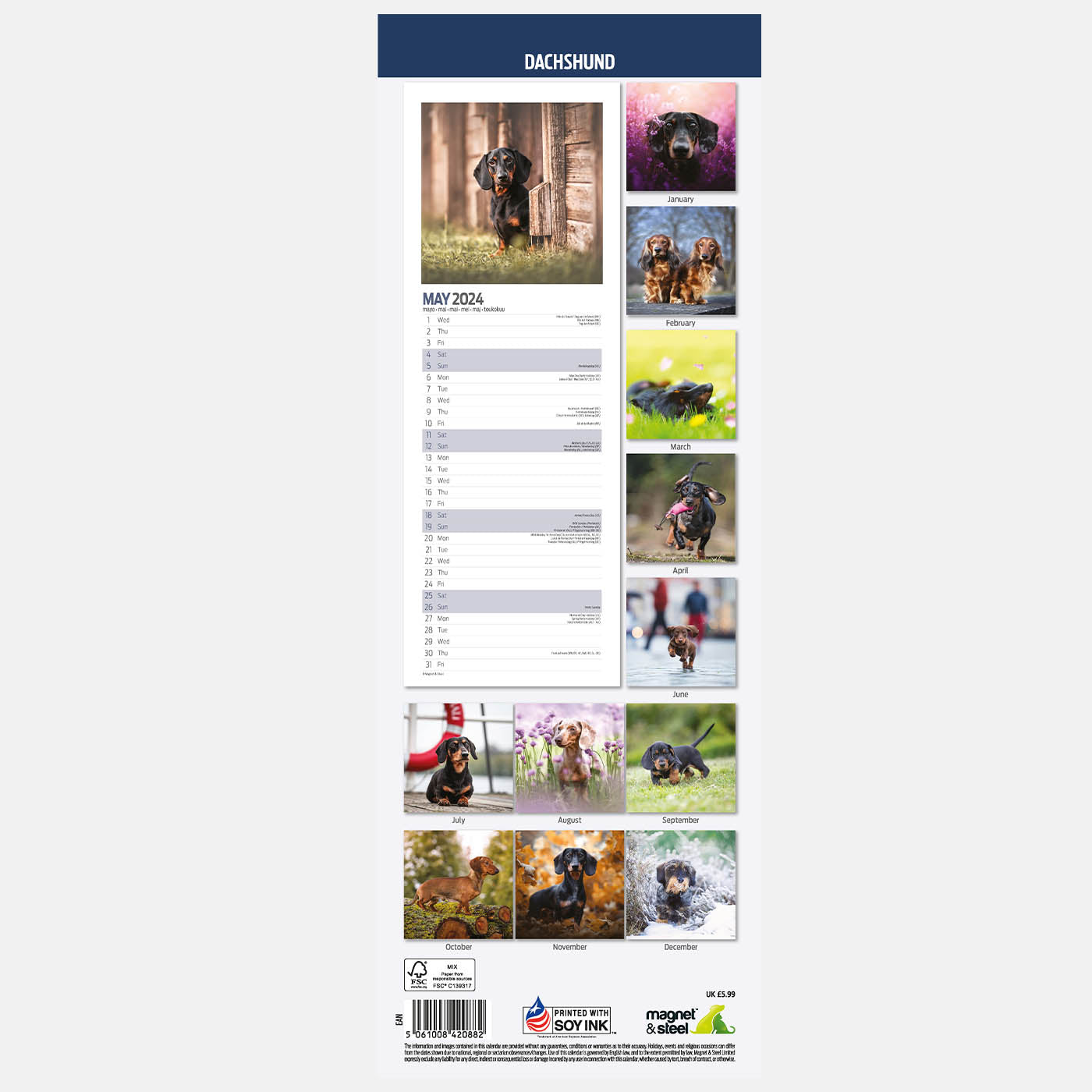 Stay organised in style with the Dachshund Slim Calendar 2025. This perfect gift for Sausage Dog lovers features adorable photos for each month, along with a clear grid and space for notes. With its slim design, it takes up minimal room while keeping you on track.