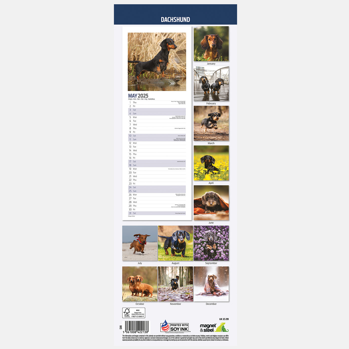 Stay organised in style with the Dachshund Slim Calendar 2025. This perfect gift for Sausage Dog lovers features adorable photos for each month, along with a clear grid and space for notes. With its slim design, it takes up minimal room while keeping you on track.