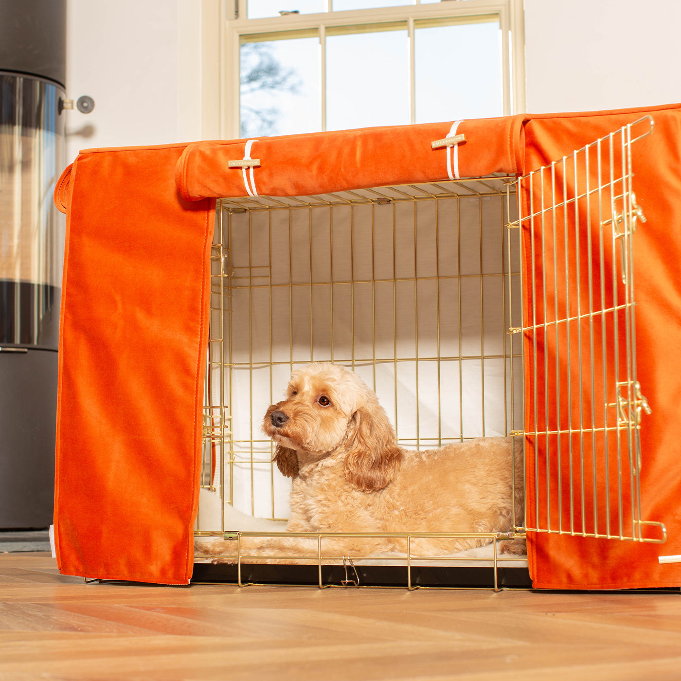 Transform your dog's crate into a stylish and cosy den with Lords & Labradors' Pumpkin Velvet Crate Cover. The rich orange hue adds warmth to any home while helping puppies develop routines and training. With adjustable doors and personalisation options, this cover is the perfect accessory for L&L heavy duty crates. Available in 4 sizes and 8 vibrant colours!