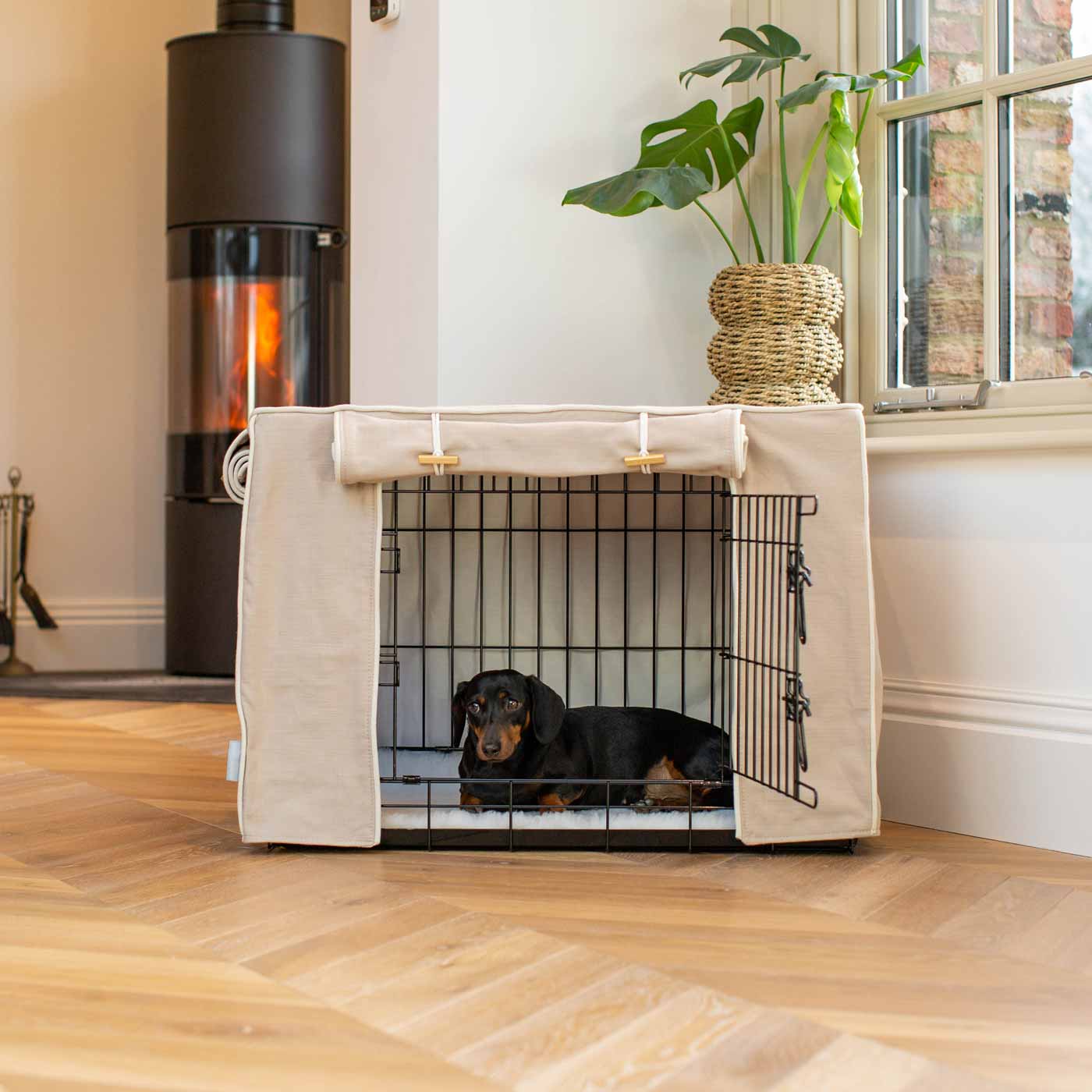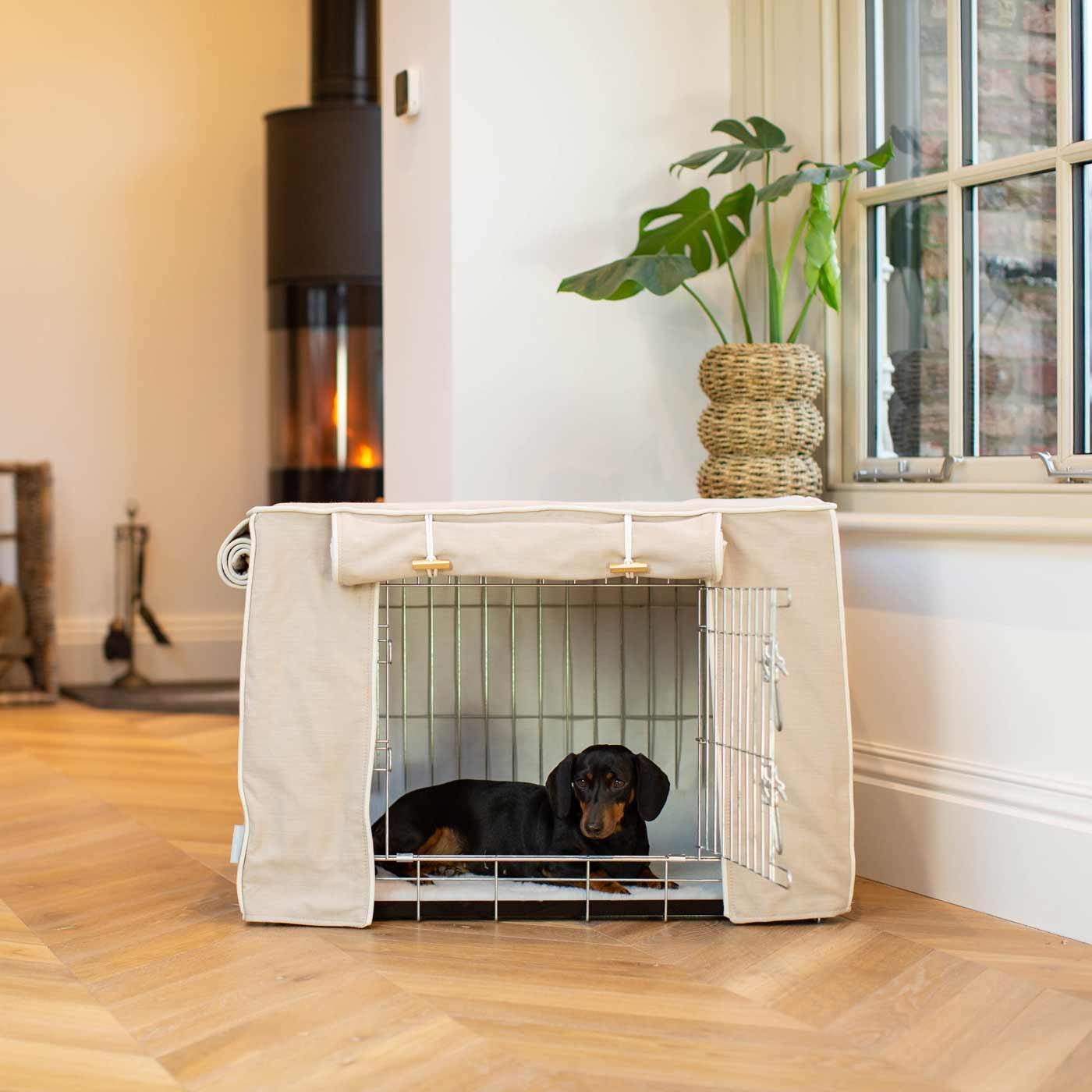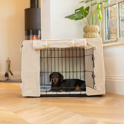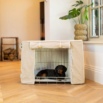 The Lords & Labradors Dog Crate Cover in Savanna Oatmeal will turn your metal dog crate into a luxury pet den. Suitable for adult dogs and puppies alike, the cover is designed to fit our double door metal dog crates. The covers are made from 100% cotton fabric and feature roll-up doors that fasten with luxurious branded toggles. The covers are fully lined and as they are all cotton, they are washable on a delicate machine cycle – practicality and style combined! This version of our cover comes in the stunning Oatmeal Savanna fabric. A modern classic made of cotton and piped in a contrast ivory piping. The oatmeal colourway is a sophisticated neutral shade that will look fabulous in any home!