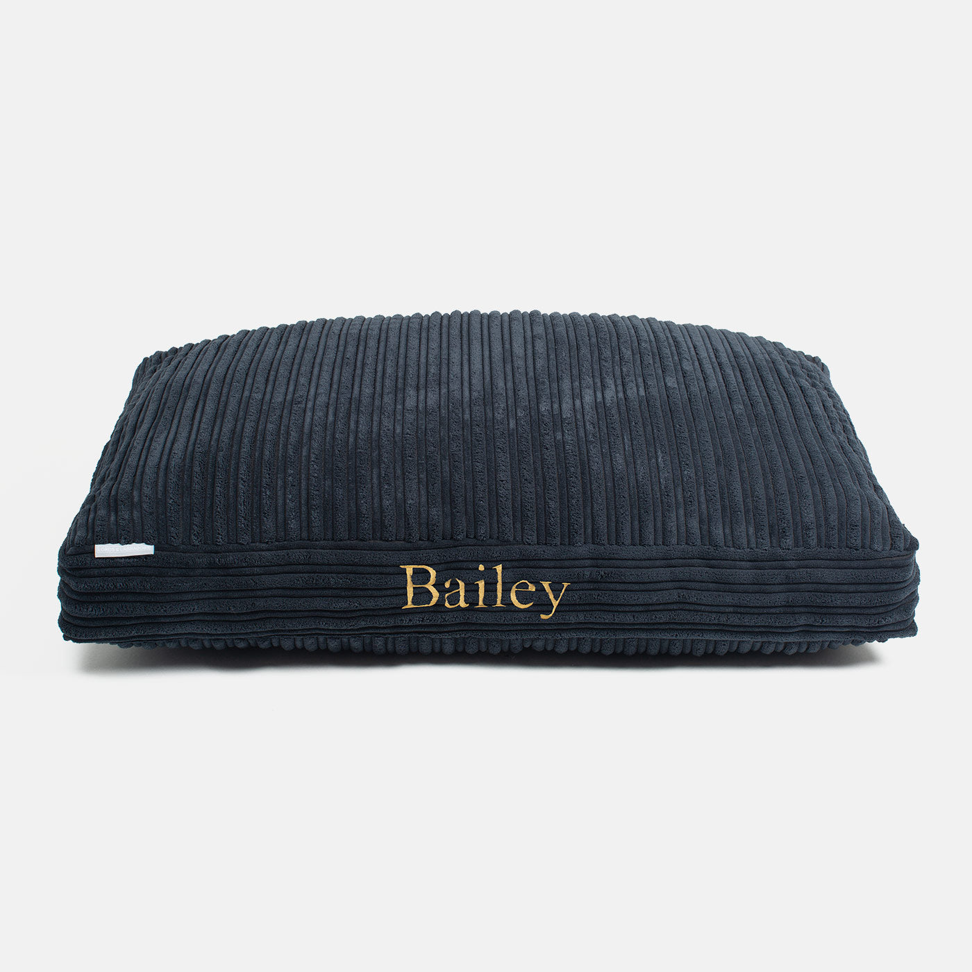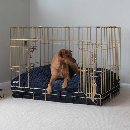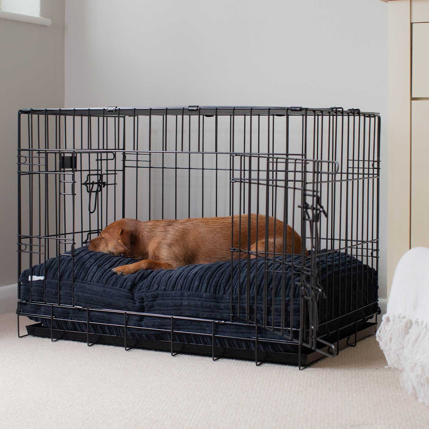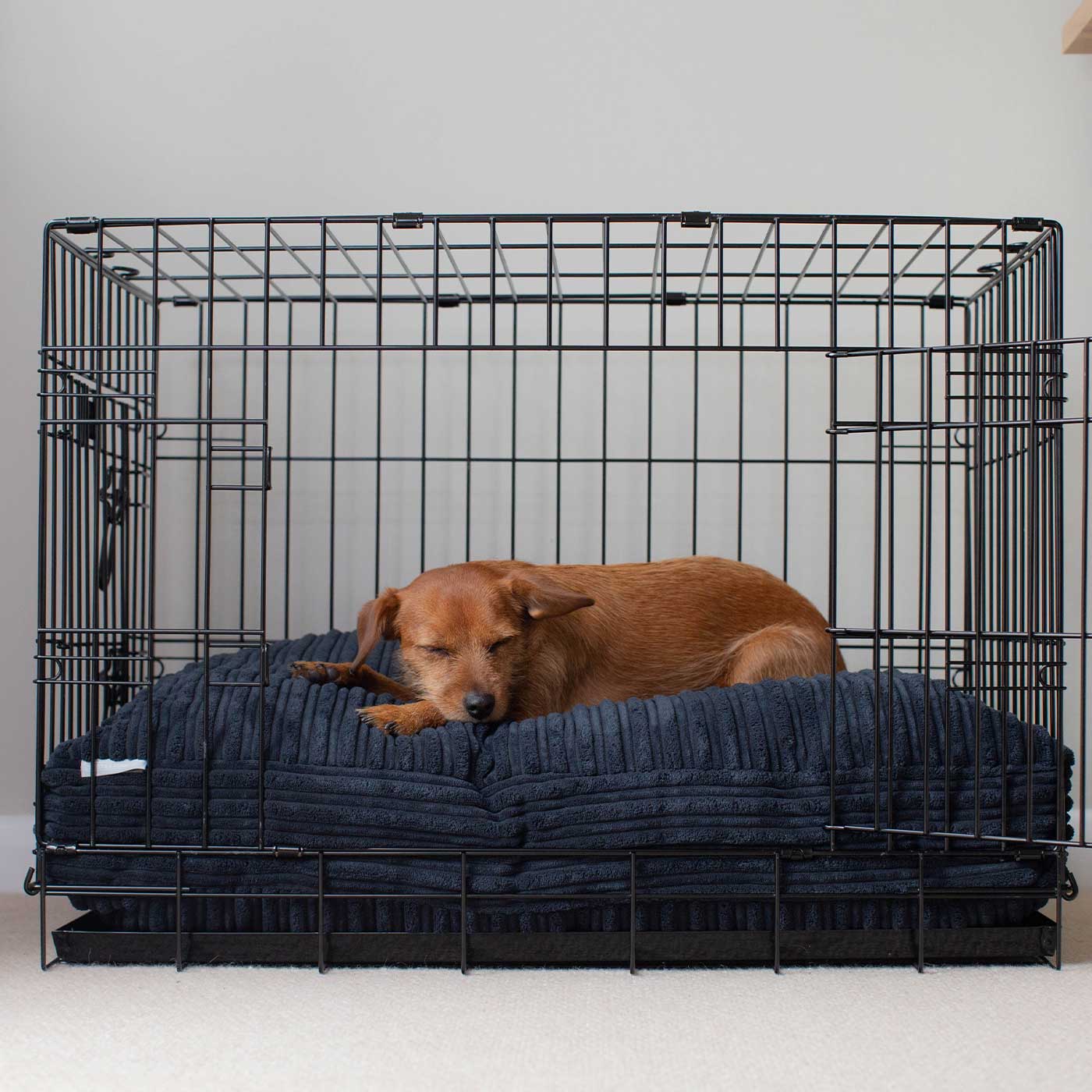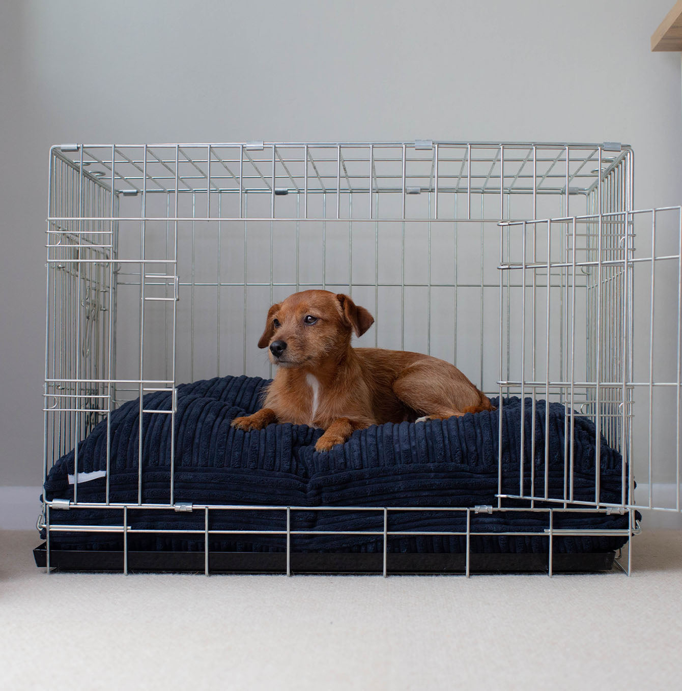 The Lords & Labradors Dog Cushion in Navy Plush will offer your adult dog or puppy the most comfortable place to nap, rest and sleep. Our cushions are deeply filled. This version of our cushion dog bed comes in super soft ribbed fabric. Versatile and timeless, it will look great in any home for years to come. The cushion comes in five sizes and is designed to be used as a stand-alone luxury dog bed or in your dog’s crate as a crate cushion. It will make the interior of your dog’s crate so comfortable and cosy.