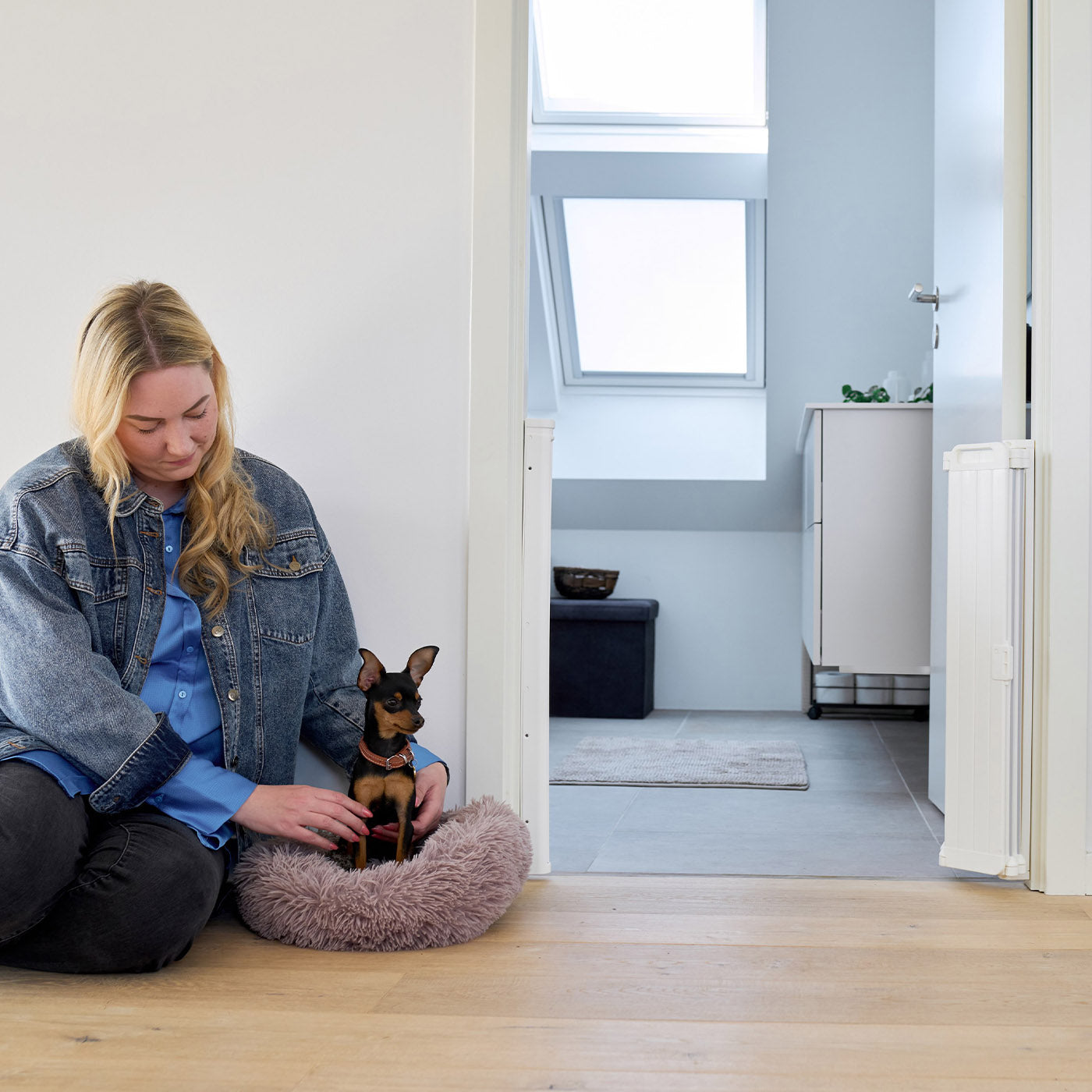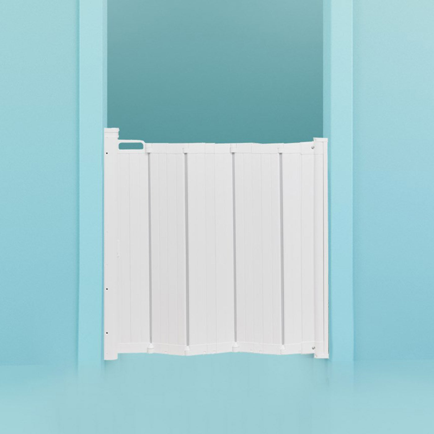 Introducing DogSpace Marley Retractable Pet Gate! Save space and keep your puppy safe with our wall mounted pet gate. No gaps means no more escaping. Say goodbye to bulky gates and hello to a clutter-free home. Available in two stylish colours. Retracts and folds up on its own when not in use. Keep your furry family member safe in a sleek and compact way.