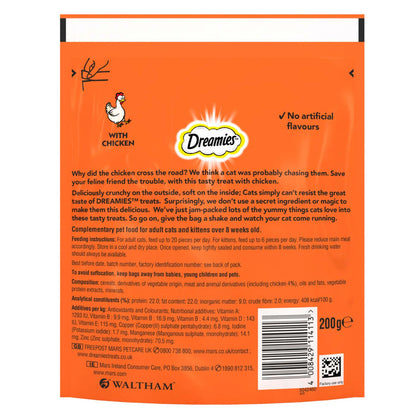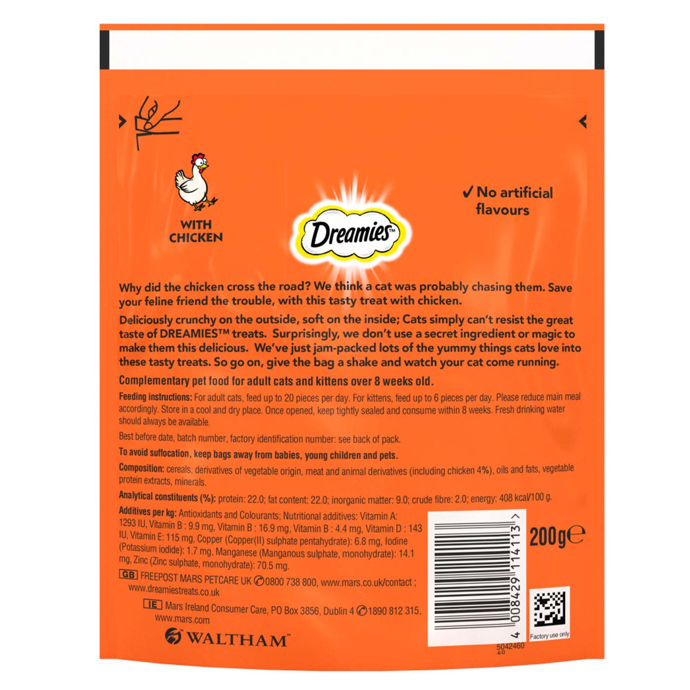 Dreamies Cat Treats with Chicken make a delicious and rewarding treat for your cat. Each treat contains irresistible chicken flavour, a crunchy outer layer, and a soft centre. With less than 2 calories per treat, they are perfect for rewarding your cat without the guilt, and they are free from artificial flavours.