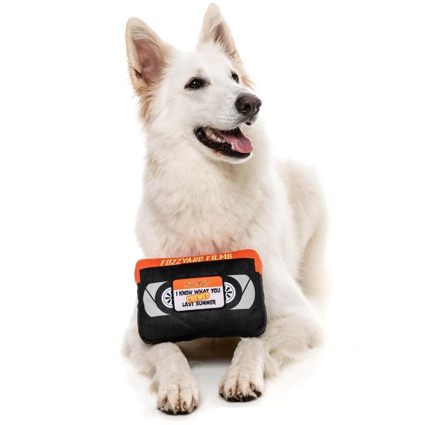Get ready for a spooky Howl-o-ween with FuzzYard Horror Film Dog Toy! This VHS tape-shaped toy features the pun-ny title "I know what you chewed last summer" and a squeaker inside for extra excitement. Plus, it's machine washable to keep fresh even after fright night.