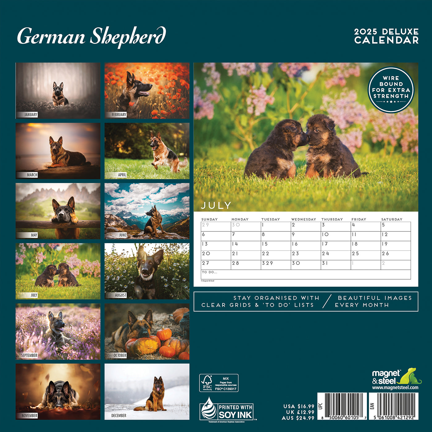 The German Shepherd Deluxe Calendar 2025 is a must-have for any Shepherd lover. Each month features an adorable photo, while the clear grid and note space keep you organised. With its wire bound design, this calendar is not only beautiful but also durable. Makes a perfect gift.