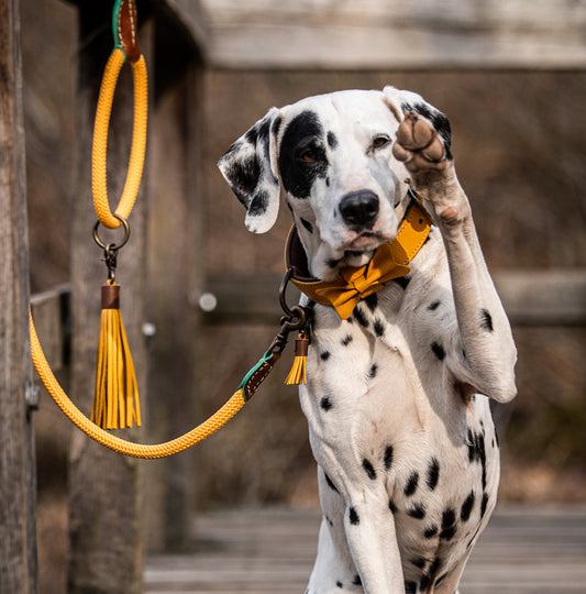 The Goldie Dog Lead by DWAM is an elegant, yet rugged accessory for your four-legged friend. Crafted with a heavy-duty 'Lobster claw' hook, it features a tough leather exterior with soft handle accents. A matching collar is also available. Ideal for those who demand both beauty and durability.