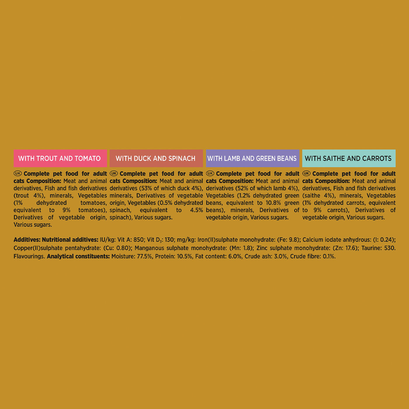 Feed your cat the best with Gourmet Gold's Cat Food Pate With Veg. This delicious set of mousses with accompanying vegetables is available in four recipes - Lamb & Green Beans, Duck & Spinach, Trout & Tomatoes, and Pollack & Carrots. Made with premium ingredients and no added colourants, artificial flavourings, or preservatives, your cat will love these nutritious and flavourful meals.
