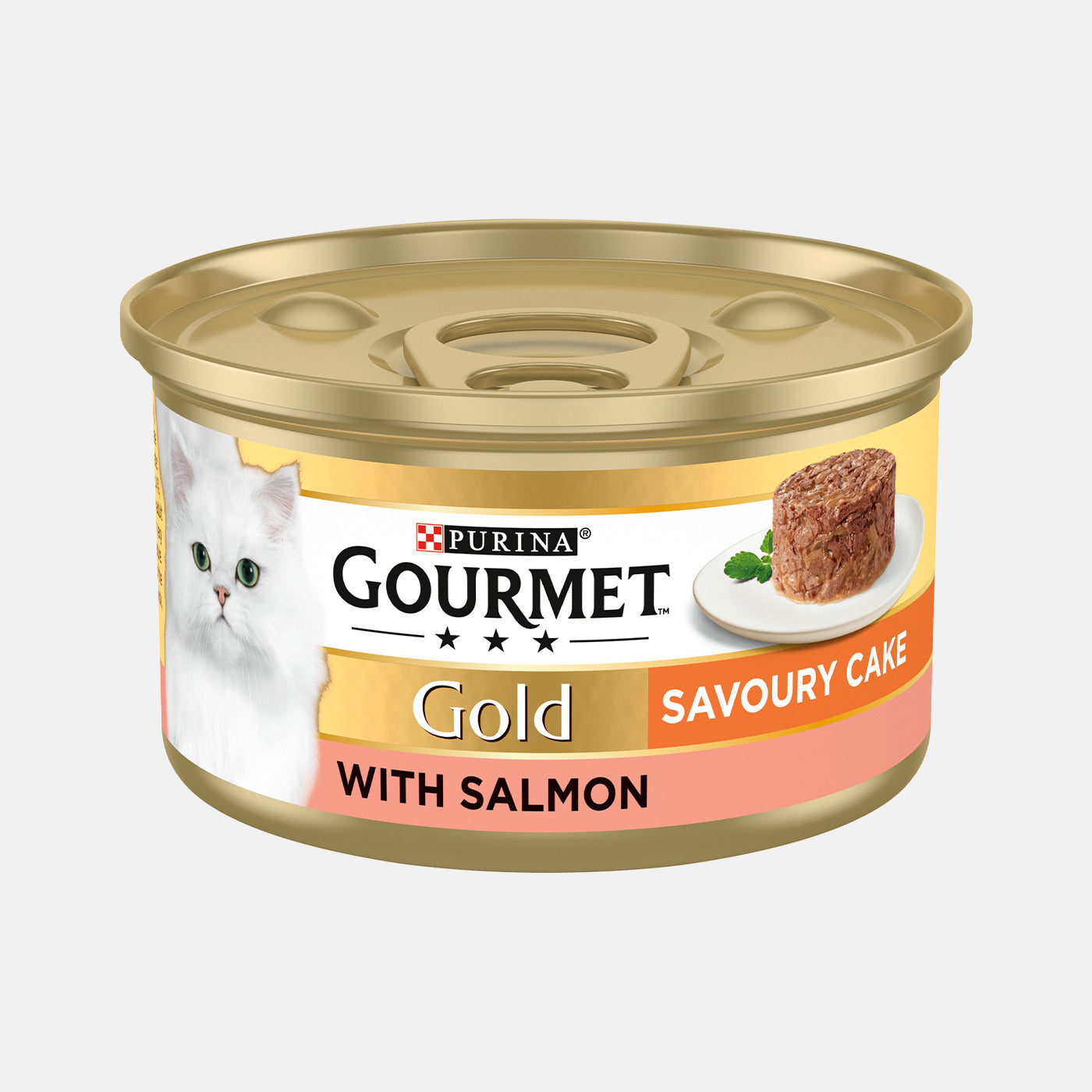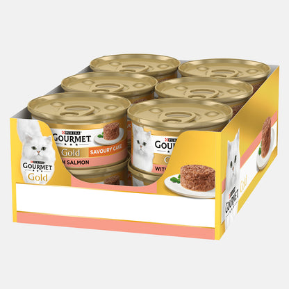 Gourmet Gold Cat Food Savoury Cake Salmon is a complete cat food with a delicious cake texture. Each 85g cake is made with delicately chopped pieces of salmon seasoned with just a hint of sauce, and is free of colourants, artificial flavourings, and preservatives. This premium recipe is made with high quality ingredients, providing a savoury and nutritious meal.