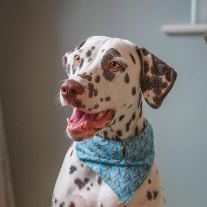 The Hiro + Wolf bandana has a long channel down the edge that simply slides onto your favourite dog collar. We'd suggest finding the matching collar in our shop so that your dog really looks the part!