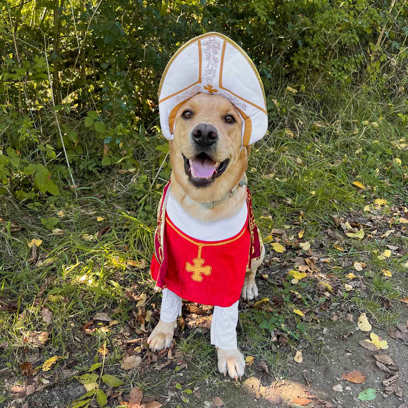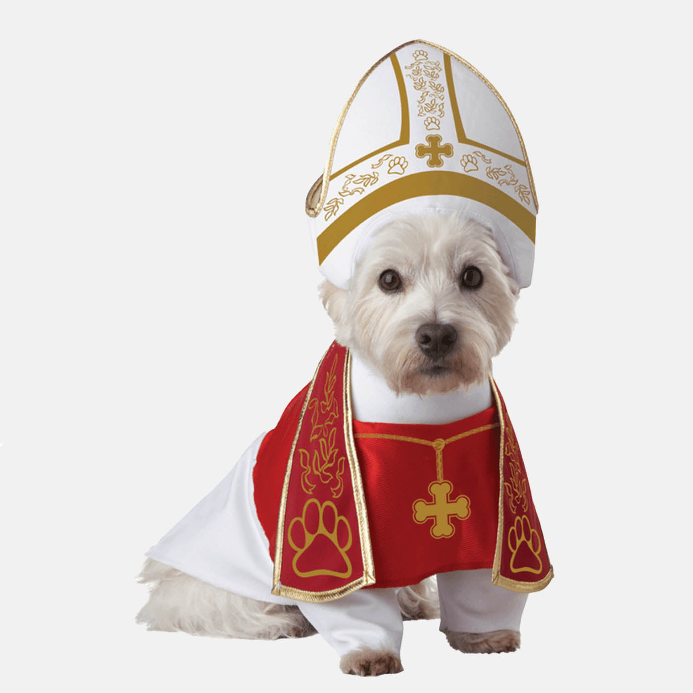 - Complete with a doggy-style mitre hat, white cassock, and red mozzetta