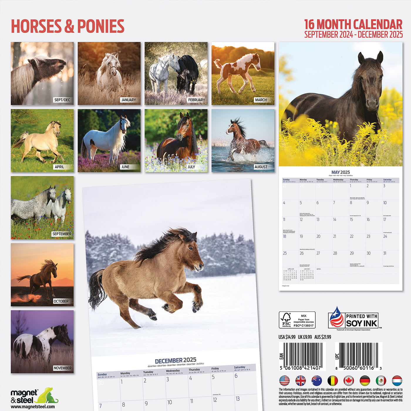 Stay organised in 2025 with this beautiful Horses & Ponies wall calendar. Featuring a stunning image for each month, it's a perfect gift for horse lovers. With clear grids and a notes section, you'll keep track of important dates and appointments. Enjoy a 16 month view, from September 2024 to December 2025.