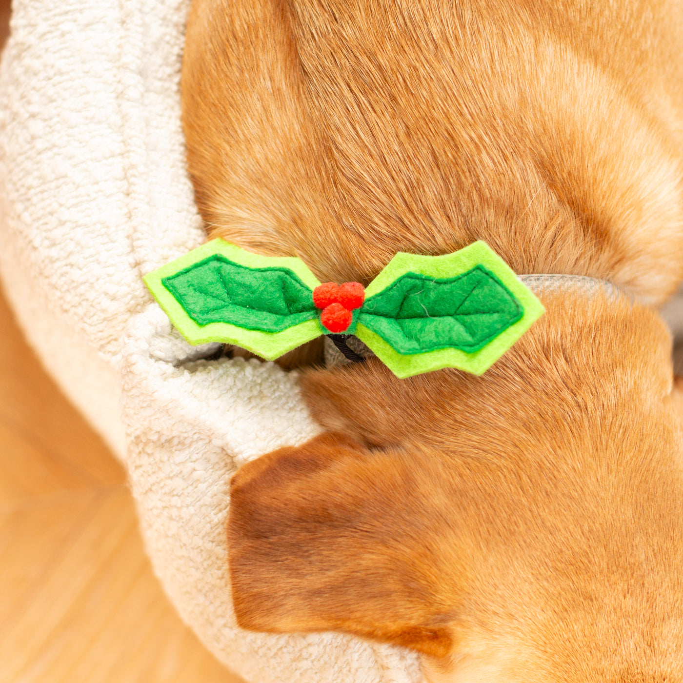 Jazz up your pup's holiday look with this House of Paws Christmas Holly Bow Tie. Made of soft felt for comfort, it easily slips onto any collar with elastic. One size fits all, making it the perfect accessory for any dog who loves to get involved in Christmas.