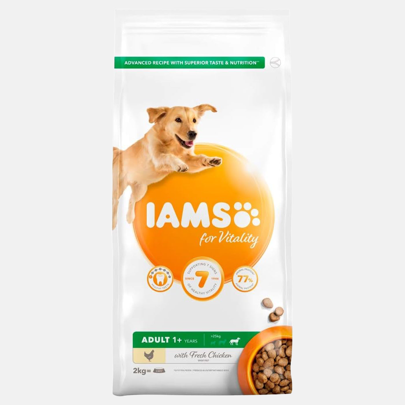 IAMS Vitality Large Breed Adult Food with fresh chicken is a 100% complete food packed with prebiotics, beet pulp for healthy digestion and large crunchy kibble for healthy teeth. It also contains tailored mineral levels to help support strong muscles and is wheat free with no artificial colours or flavours. Perfect for large breeds, this nutritious food formula helps keep them healthy and strong.