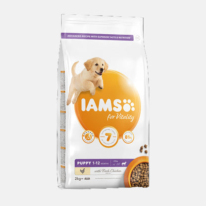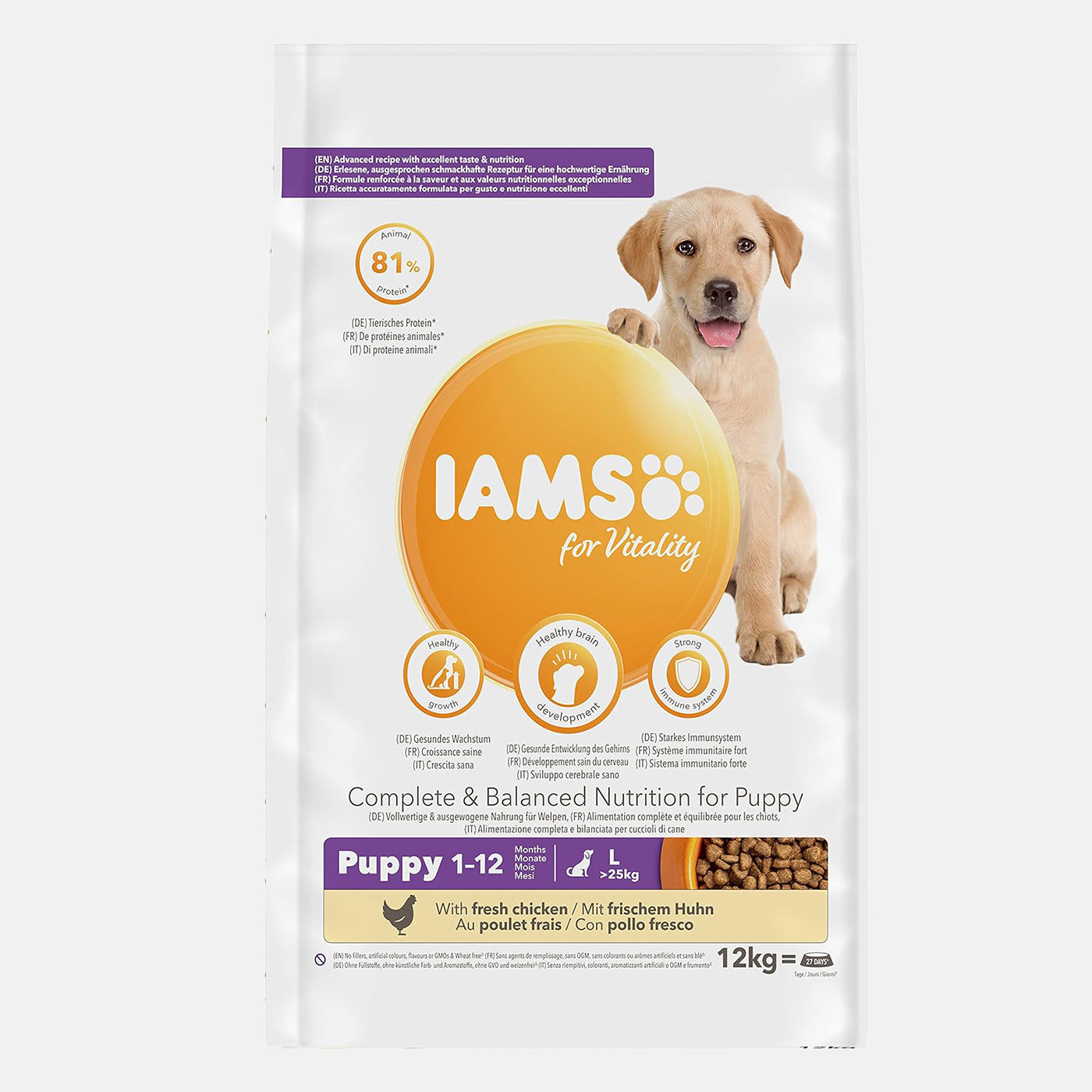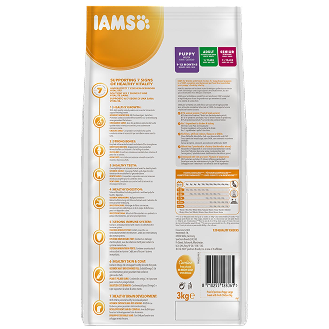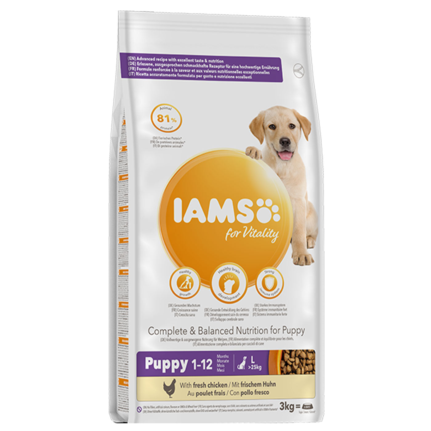 IAMS Vitality Large Breed Puppy Food with Fresh Chicken is packed with the essential nutrients your puppy needs. This 100% complete and balanced meal contains fresh chicken, minerals to support healthy growth, plus vitamin C & E to help boost immunity. Wheat-free and free of artificial colours, flavours and GMOs, this wholesome recipe helps promote healthy brain development, so your puppy can grow strong and healthy.
