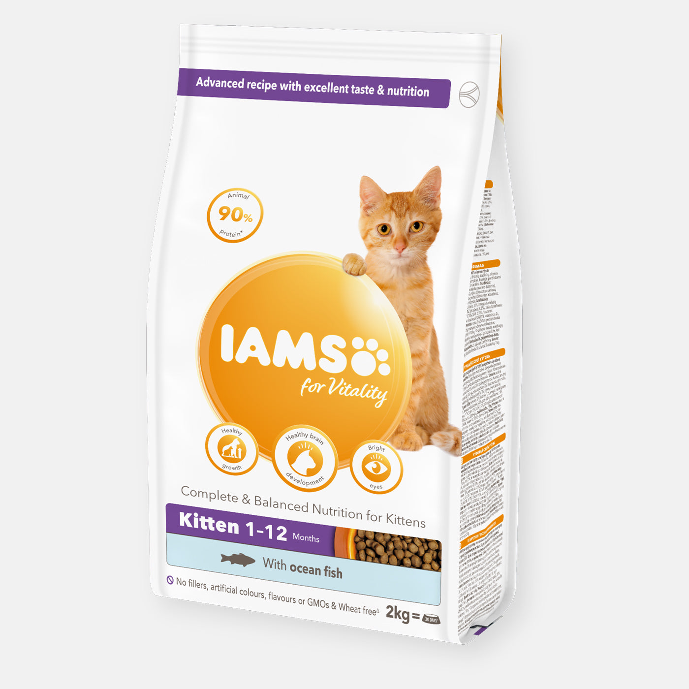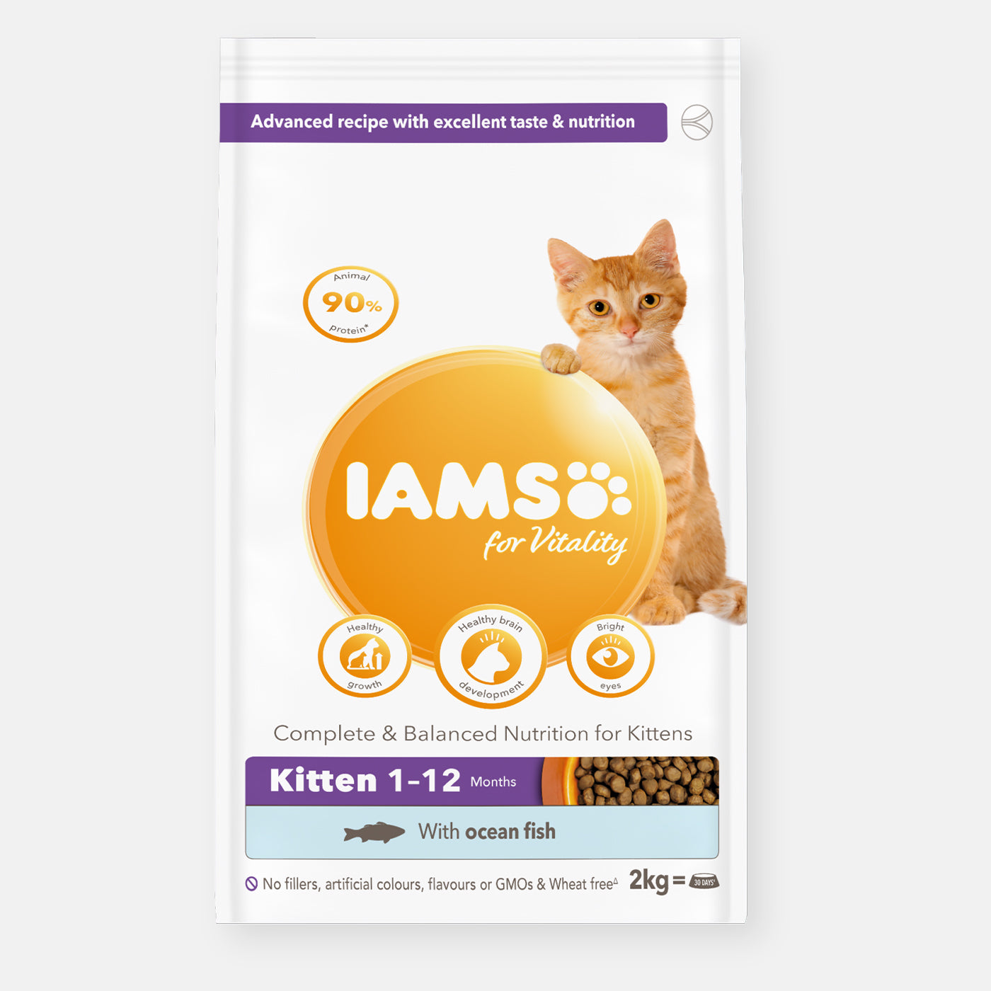 This IAMS Vitality Ocean Fish Kitten Food provides 100% complete and balanced nutrition for your kitten's healthy vitality. Its high animal protein content supports strong bones and muscles, while Omega 3 & 6 nourish the skin and coat. Plus, a wheat-free recipe promotes healthy vision, digestion and dental care, and contains no added fillers, artificial colours, flavours or GMOs.