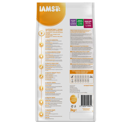 IAMS Vitality Senior Dry Cat Food is a complete formula made for cats 7 years and older. It offers a wheat free recipe with lower fat and calories for healthy weight maintenance. Formulated with beet pulp and prebiotics, cats will have improved digestion, as well as essential nutrients for healthy joints. Plus, it is free of any artificial colours, flavours, or GMOs.