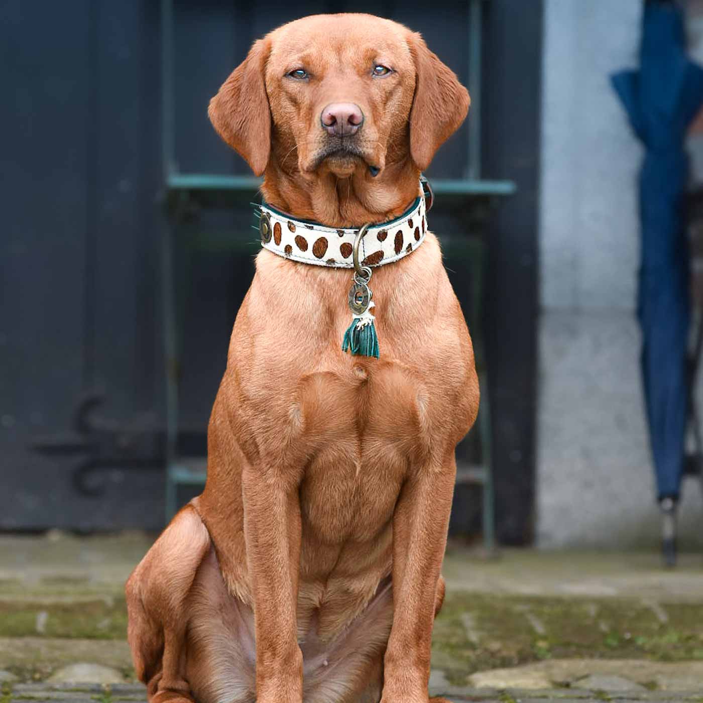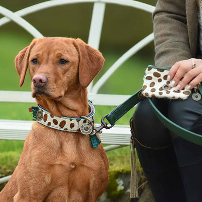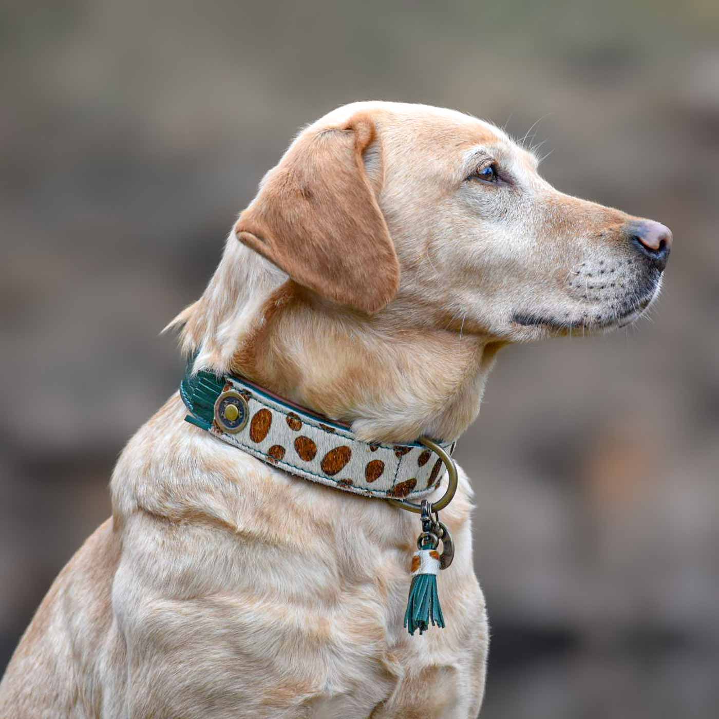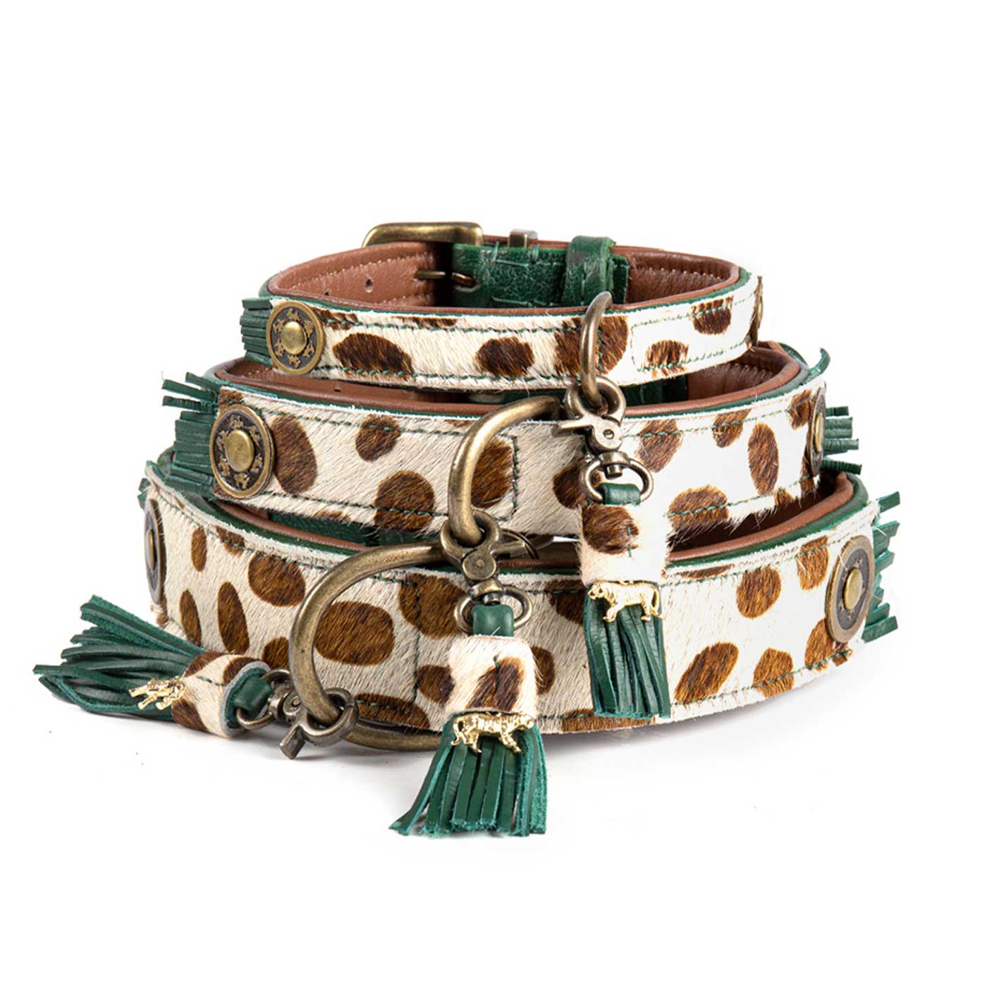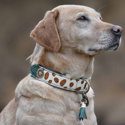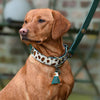 Elevate your pup's look with the Ivy Dog Collar by DWAM. This stylish collar features a unique animal print design, crafted with sturdy leather and brass hardware for durability. Complete the look with a matching lead. Available in 7 sizes for all breeds. Make your dog the star of the pack.