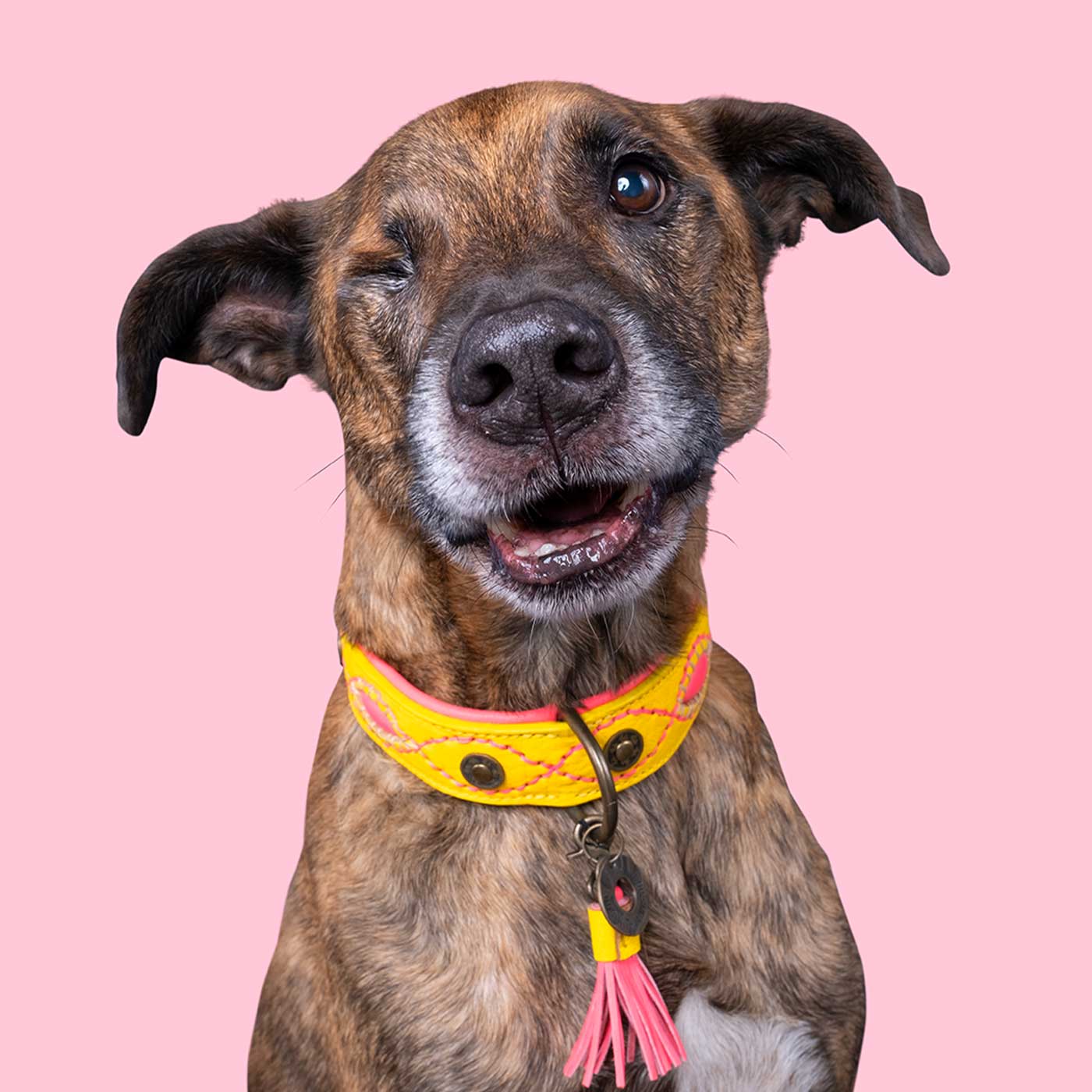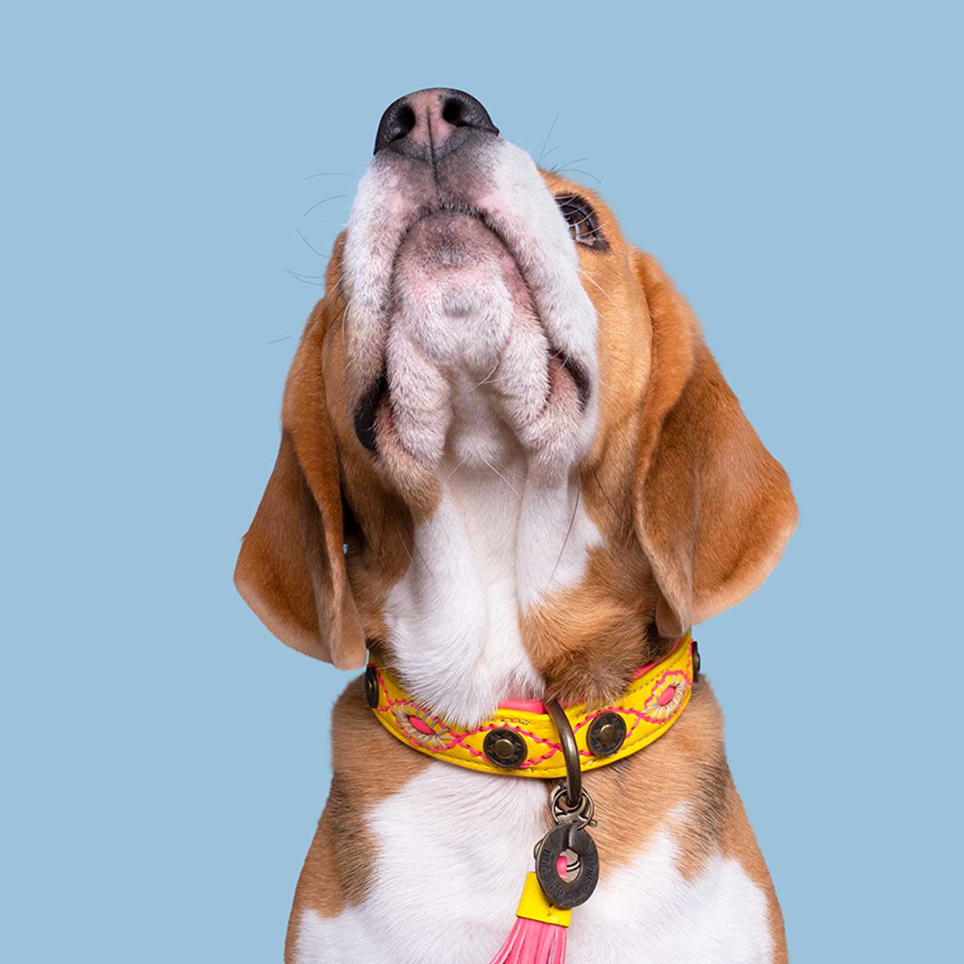 Expertly crafted from tough leather and hand-stubbed with solid brass, the Jessie Dog Collar by DWAM is the perfect blend of durability and style. The soft padding inside ensures comfort for your pooch, while the sturdy brass buckle guarantees easy lead attachment. Available in 7 sizes, this beautifully detailed collar is a must-have for any stylish dog owner.