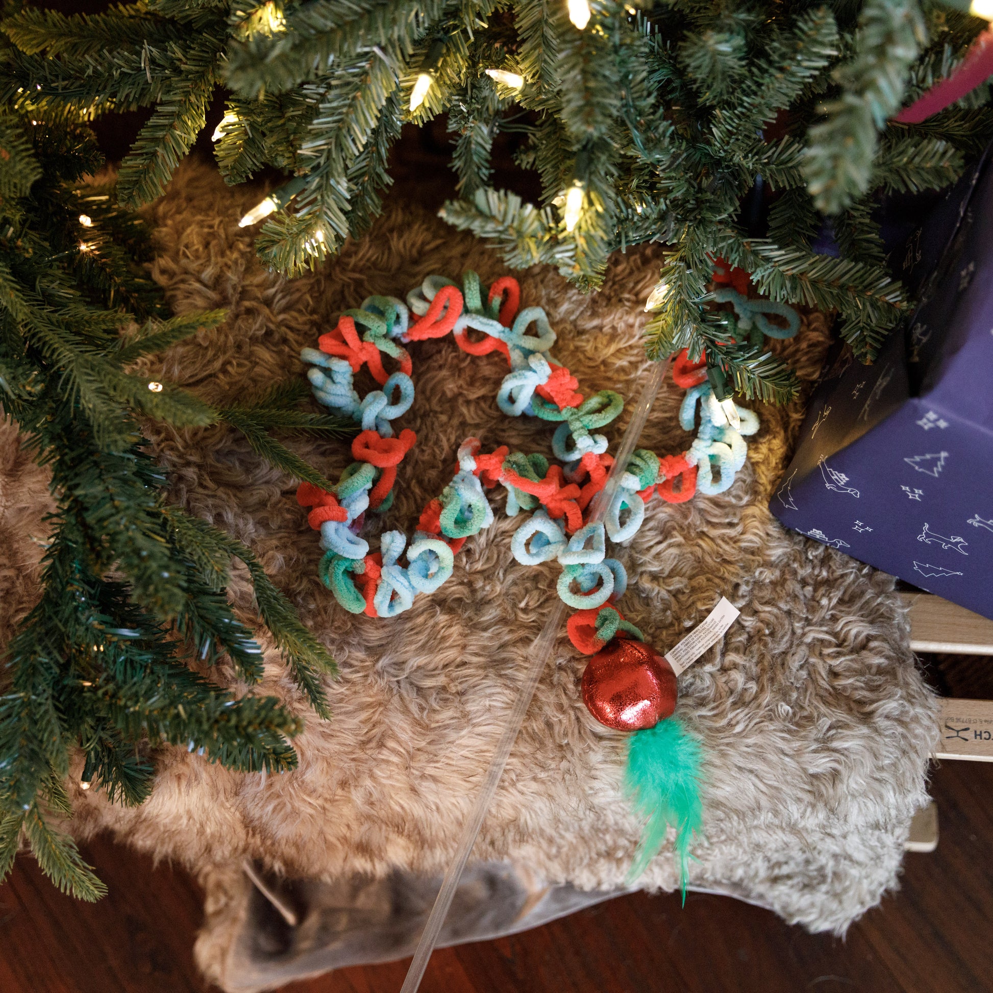 - Festive, fluttery red and green yarn and green feathers spark natural instincts