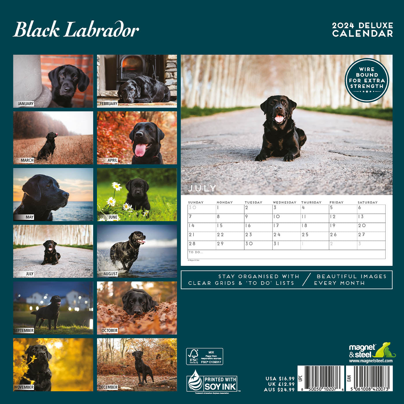The Black Labrador Deluxe Calendar 2025 is the perfect gift for Labrador lovers. With adorable photos for each month, a clear grid for notes, and wire binding for extra strength, you'll stay organised and on top of your schedule with this deluxe calendar. Show your love for Labradors all year long.