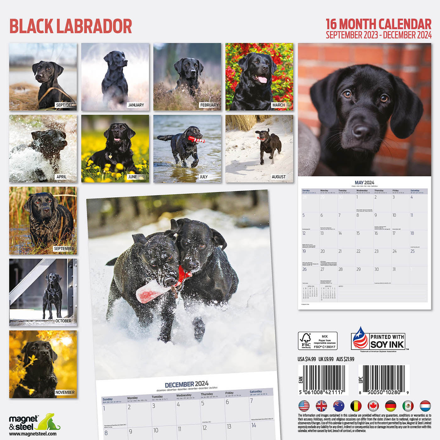 This 2025 Black Labrador Traditional Calendar is the perfect gift for Labrador Black lovers. It features a cute photo for each month and a clear grid with ample space for notes to help you stay organised. With a 16-month span, this calendar will last from September 2024 to December 2025.