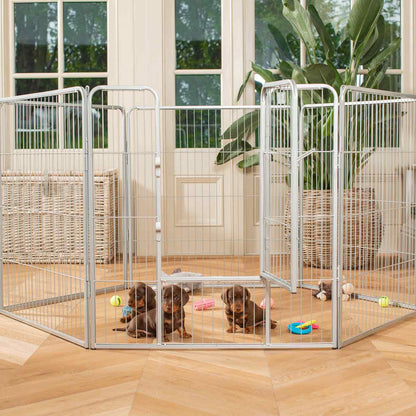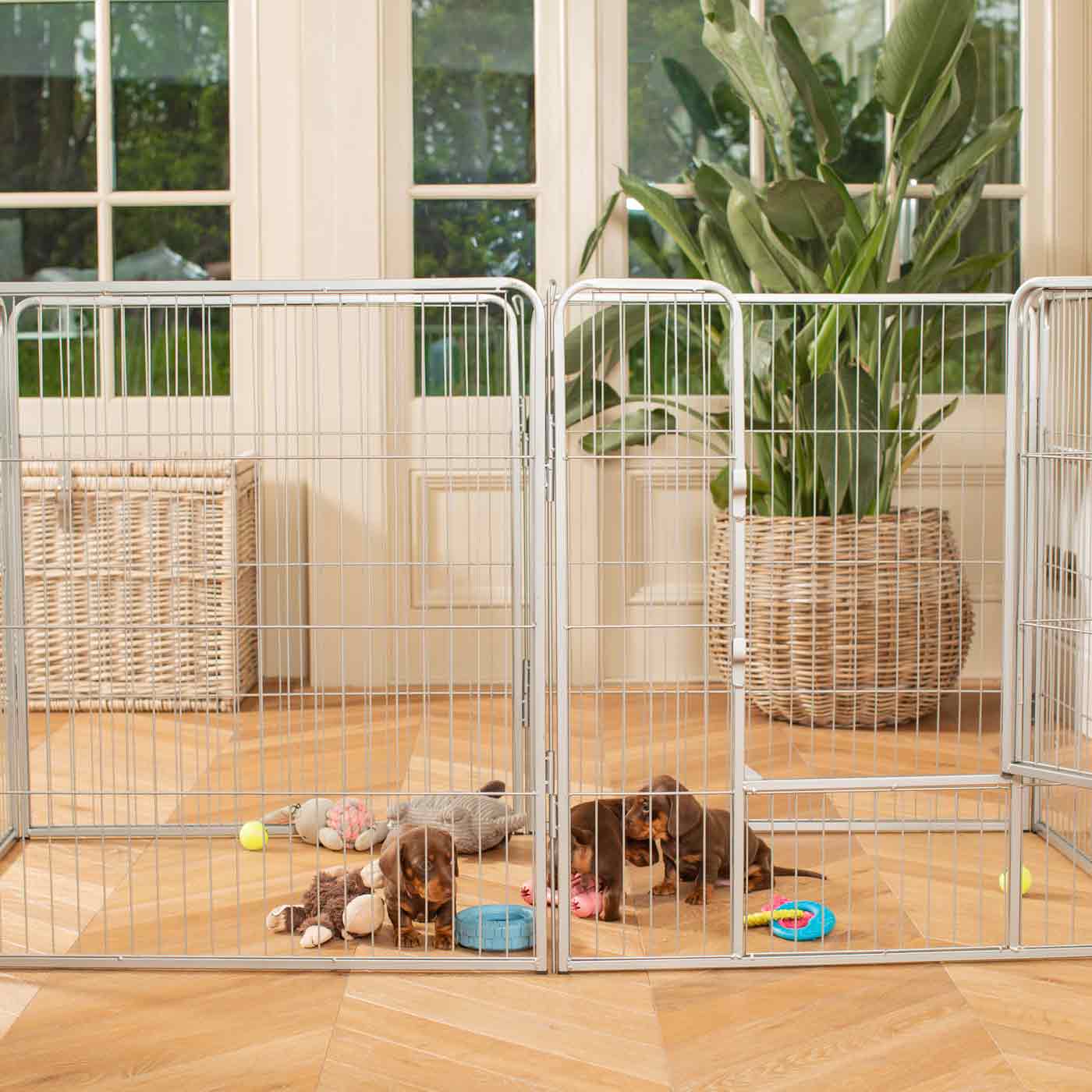 The stylish grey Lords & Labradors Puppy Pen has a super practical modular design that can built in various layouts. It will look great in all homes. It's ideal for helping to settle new puppies in at home, keeping them safe whilst they're still getting used to daily routine. The pen can be easily attached to any crate with the brackets included, just remove one pin to open the pen and attach each side to the crate.