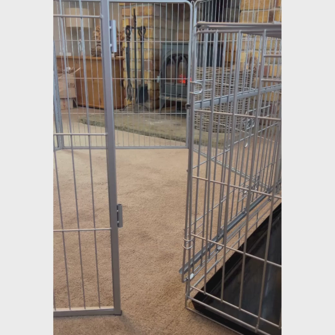 - A grey metal play pen with brackets included to attach to any crate as an extension